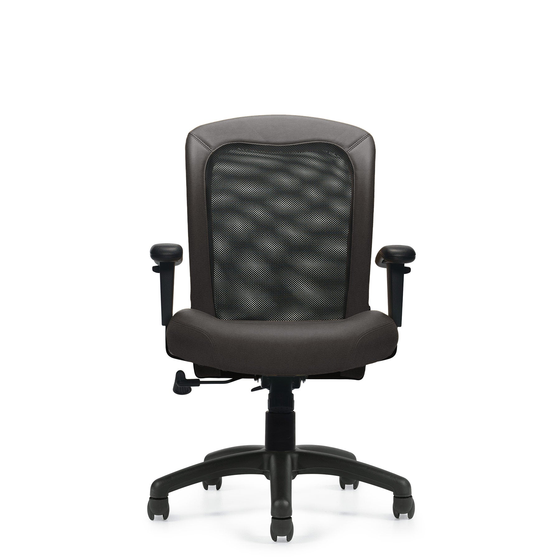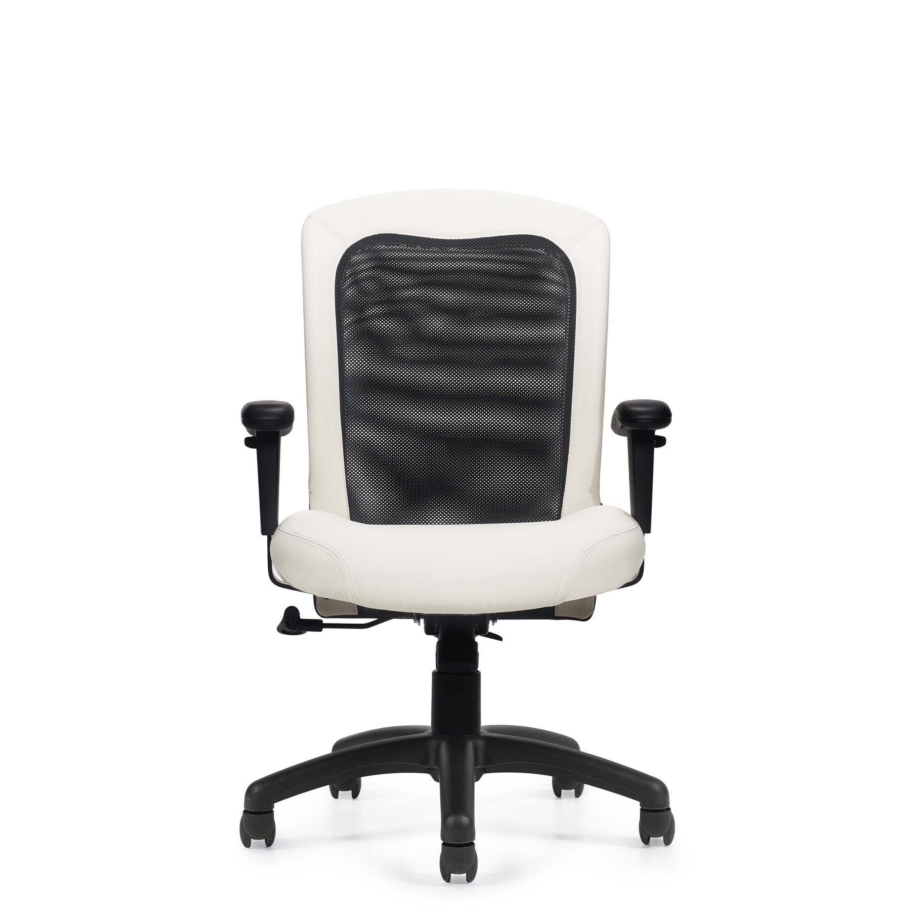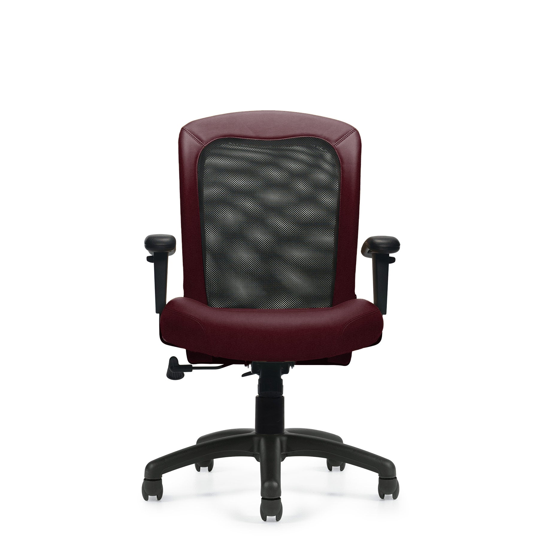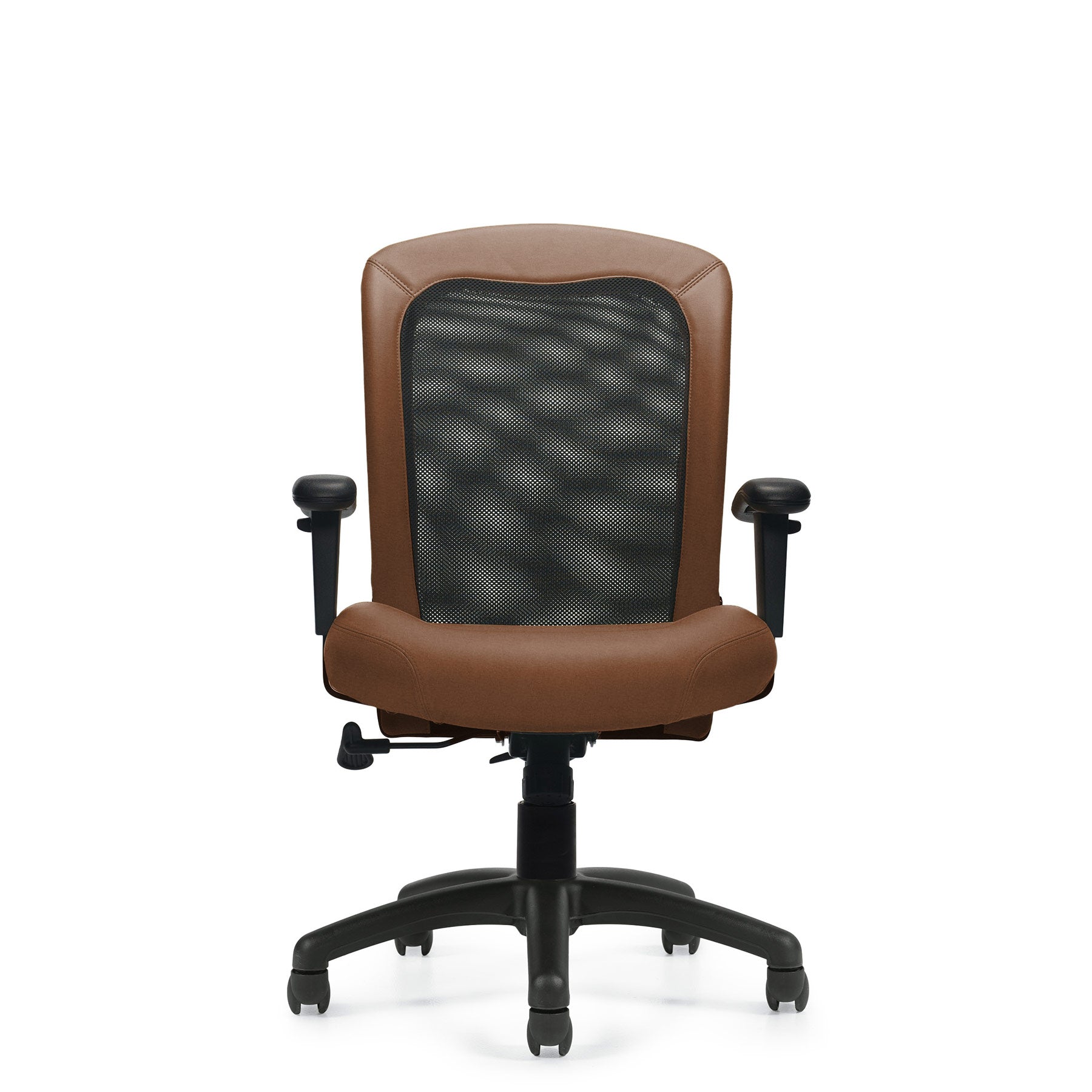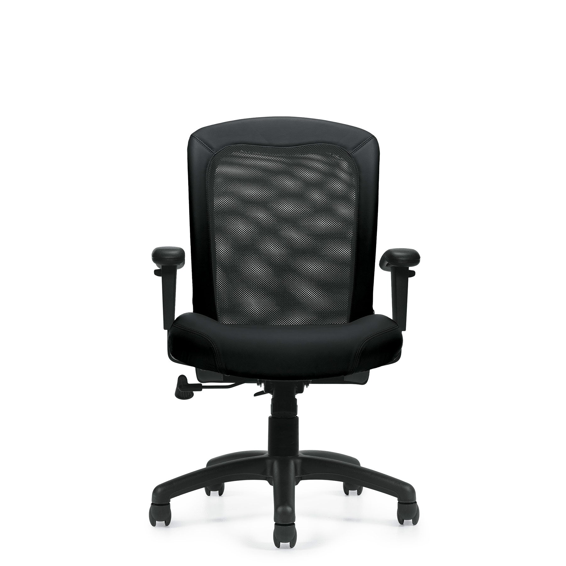This chair is fitted with a black mesh fabric, a synthetic leather rim, and a Luxhide seat with hole-punched details. Height and arms are adjustable with a one-position tilt lock and tilt tension modification, and the seat depth can be customized. The chair is complete with twin wheel carpet casters.