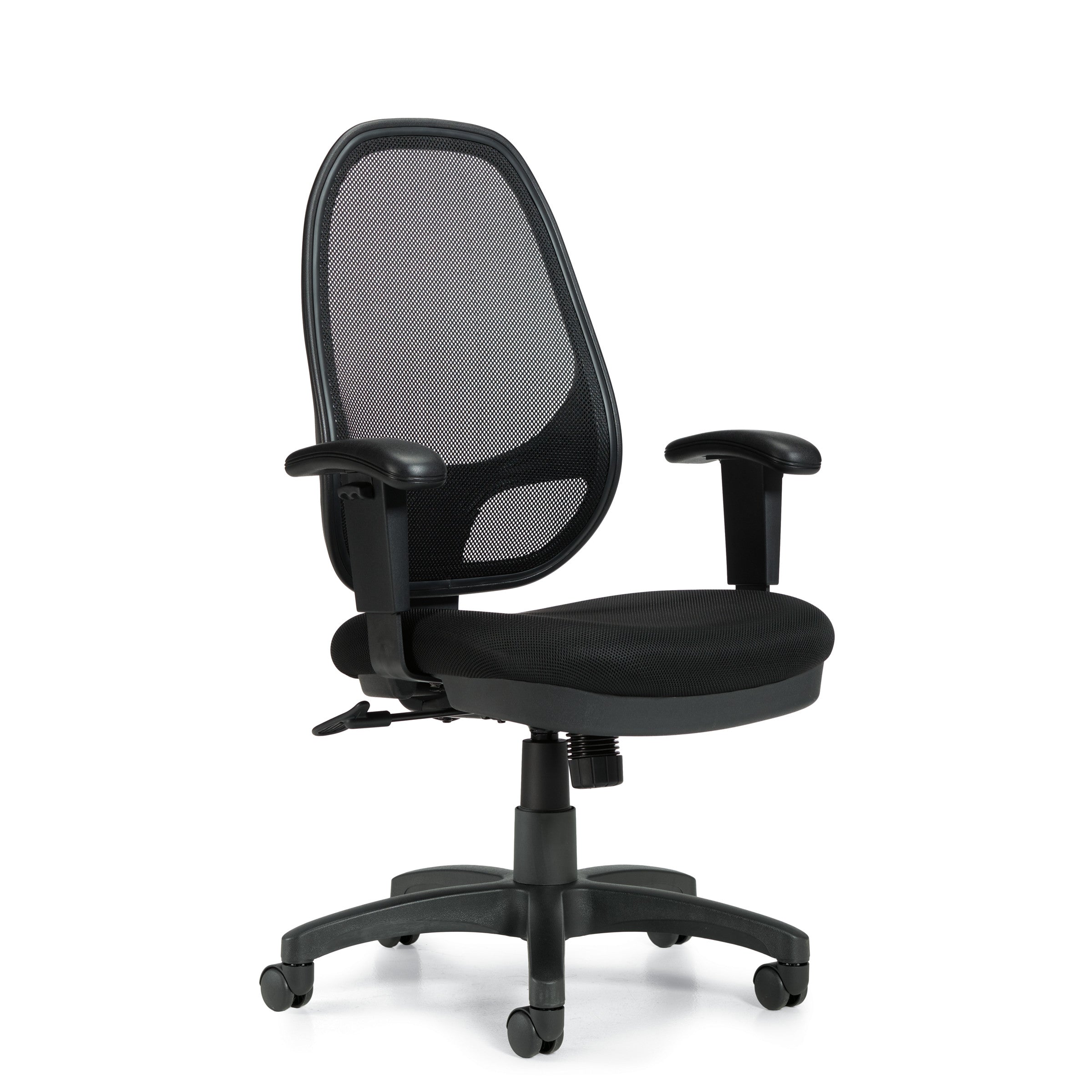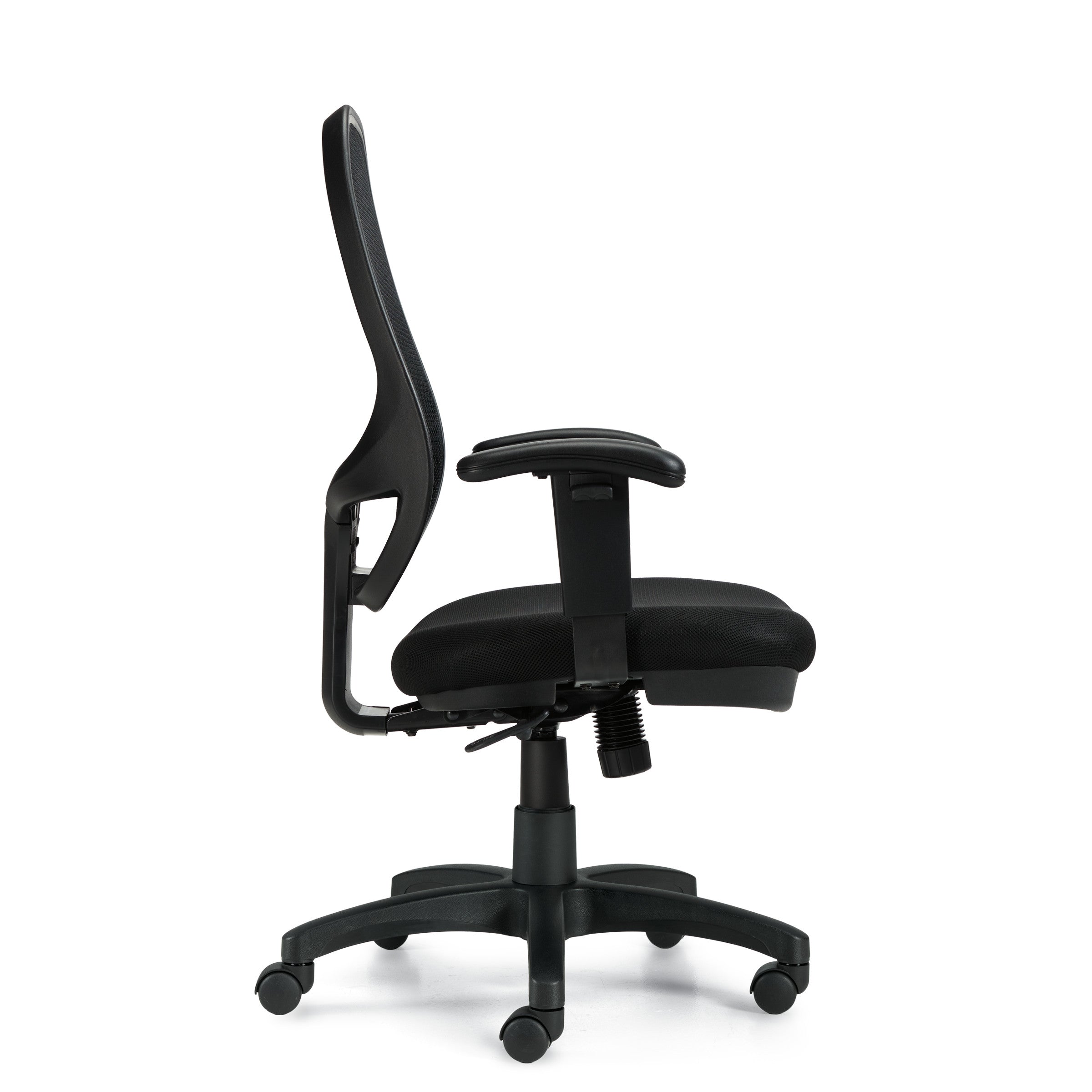 Featuring a black mesh back and black mesh fabric seat for enhanced breathability, this chair also has a pneumatic seat height adjustment, height-adjustable arms with comfortable polyurethane armrests, a synchro-tilt chair control with adjustable tension, a single-position tilt lock, and twin-wheel carpet casters.
