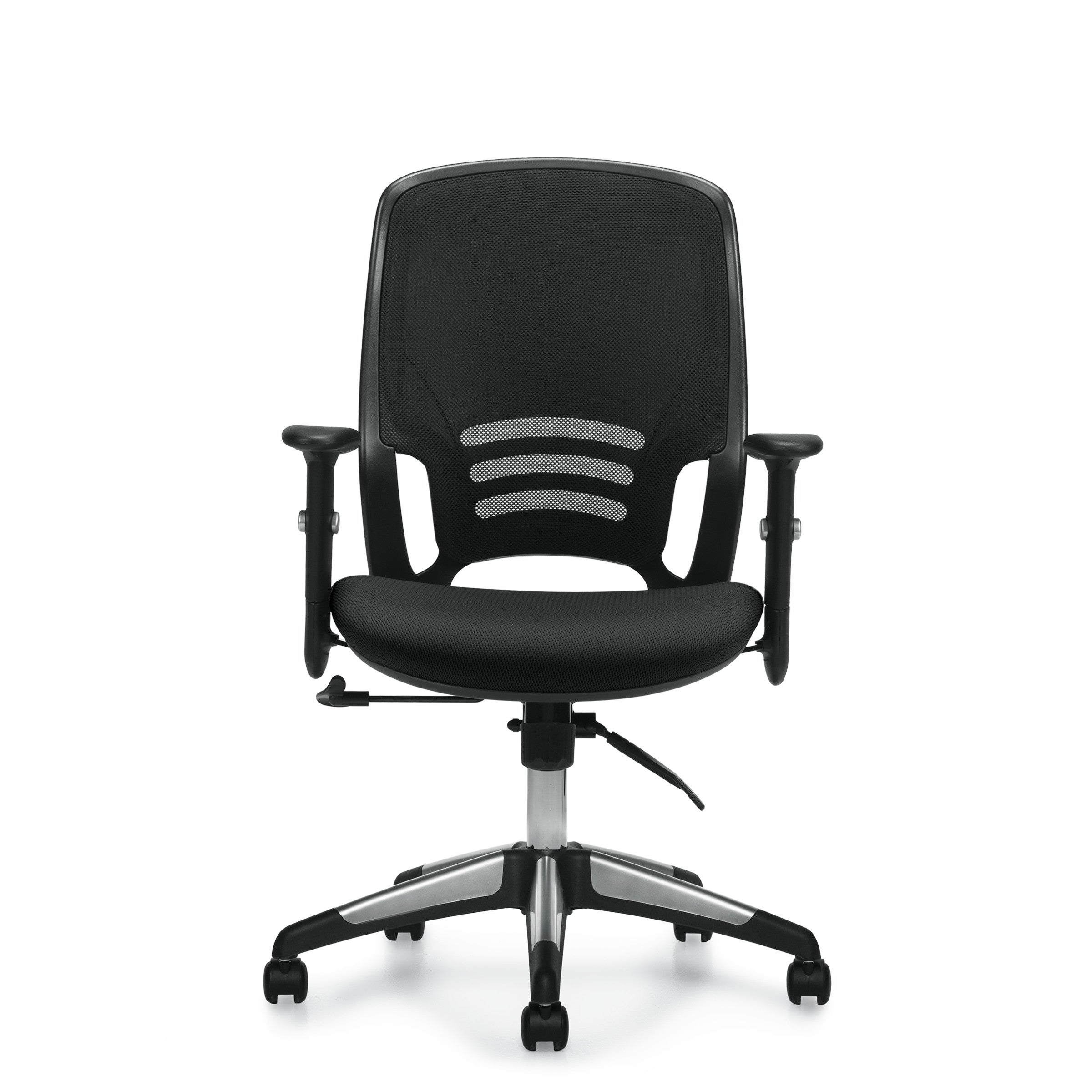 Featuring a black mesh back and breathable black mesh fabric seat, this chair also includes pneumatic seat height adjustment, adjustable arms with polyurethane armrests, synchro-tilt chair control with infinite position tilt lock, and twin wheel carpet casters for mobility.