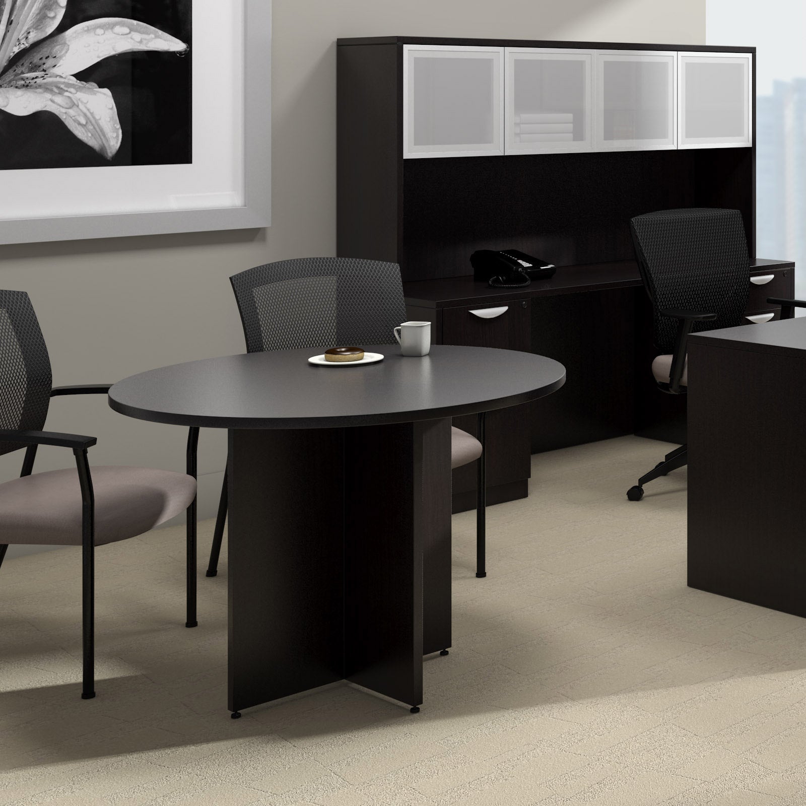 [GOF Conference Table & Chair Set Series] This circular table and chair set can be used in many applications, such as small team meetings, collaborative study rooms, and break rooms, without taking up too much space. The contemporary cross-base table will complement a sophisticated meeting room or open workspace. These items are heavy and oversized, please (1) provide a valid phone number, so the freight company can contact you to schedule a delivery appointment, (2) arrange to have help on hand when the product arrives to take it into your place.