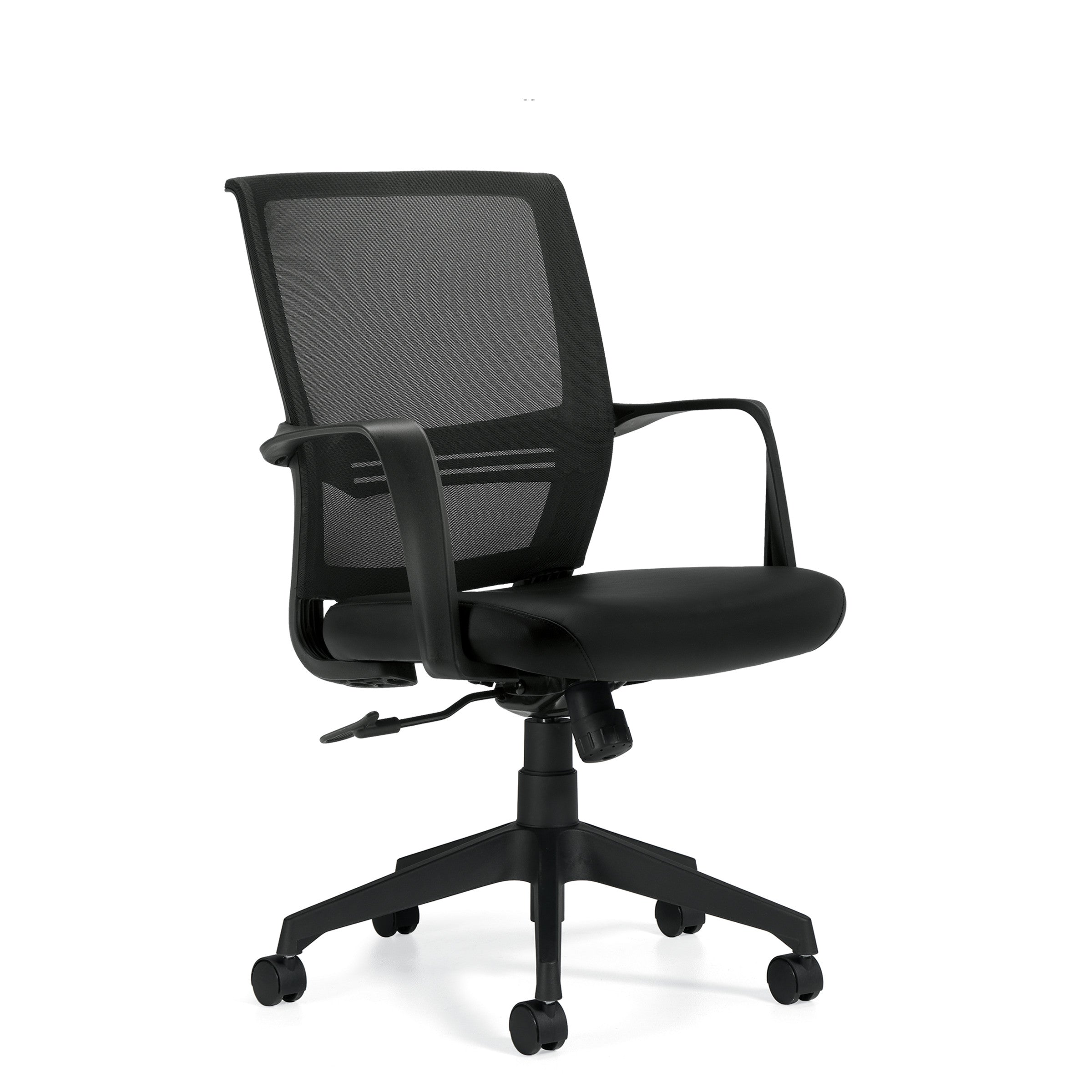 This Low Back Mesh Back Tilter Chair offers a black mesh back paired with a black Luxhide seat, pneumatic seat height adjustment, fixed "twisted ribbon" molded arms, single position tilt lock, and tilt tension adjustment. It also includes a scuff-resistant, high-rise base with twin wheel carpet casters.