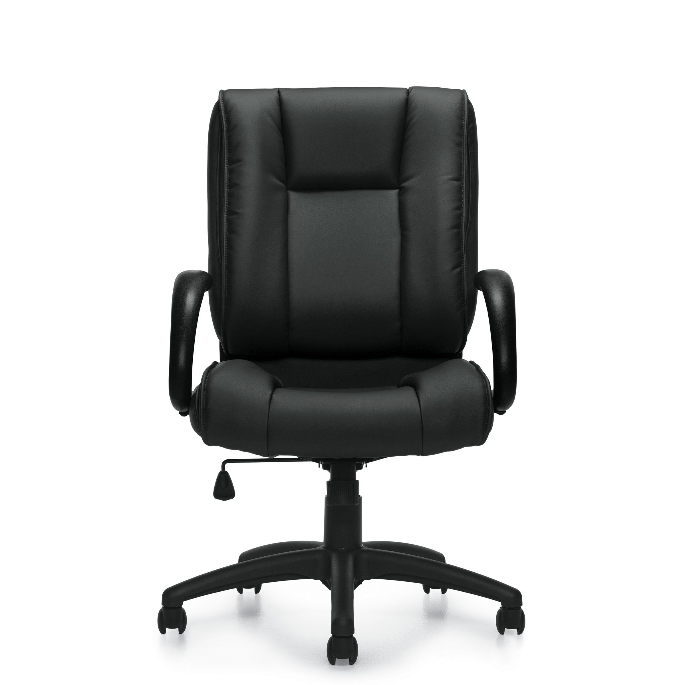 This executive chair from High Back features black Luxhide upholstery and faux leather trim, a pneumatic height adjustment, polyurethane "reverse curve" arms, a single position lock with tilt tension control, and twin wheel carpet casters.