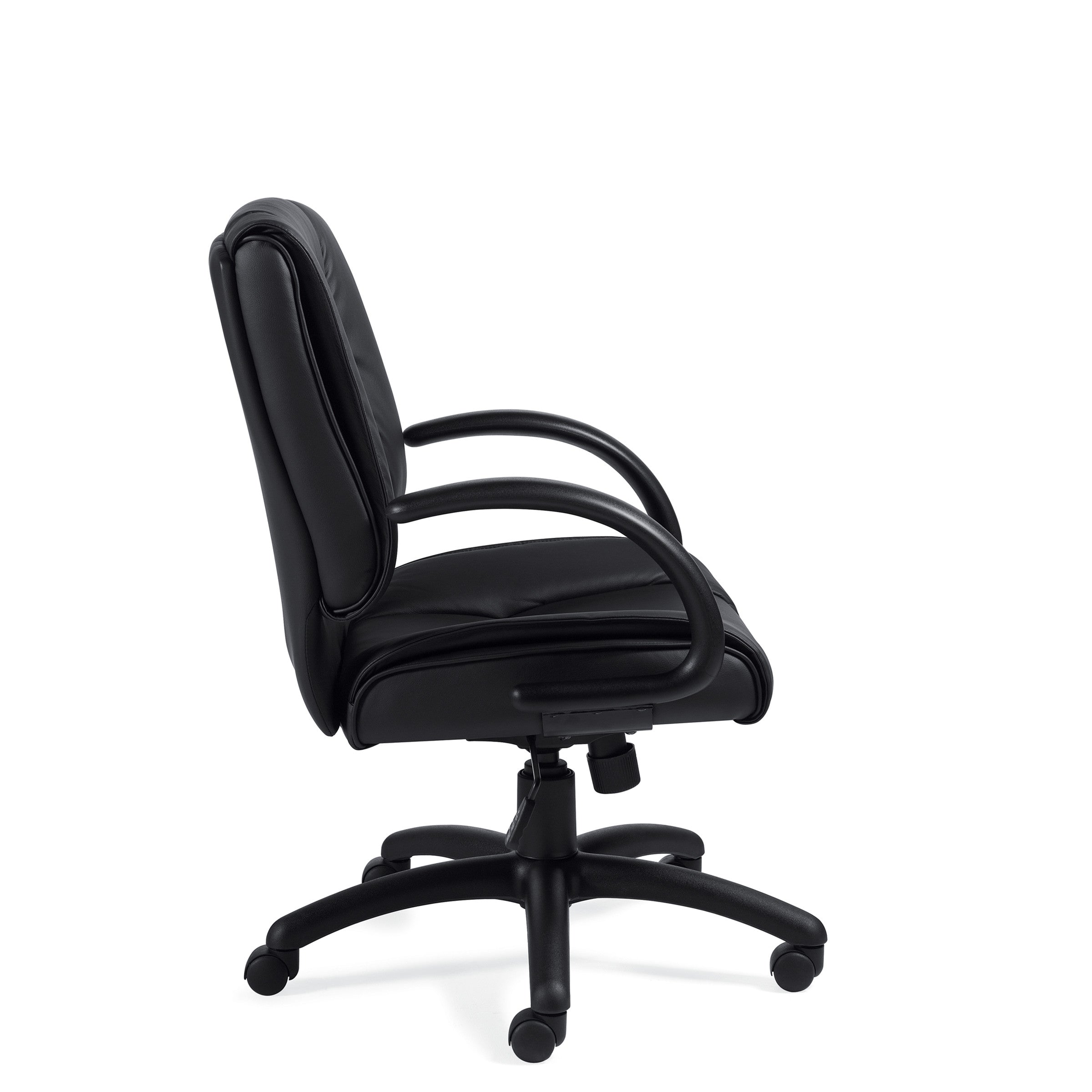 This Mid Back Luxhide Executive Chair is upholstered with a black Luxhide with a faux leather trim. It has a single-position tilt lock and tilt tension adjustment that can be adjusted pneumatically and also features arms with a polyurethane "reverse curve". Not to mention, it is equipped with smooth rolling twin wheel carpet casters.