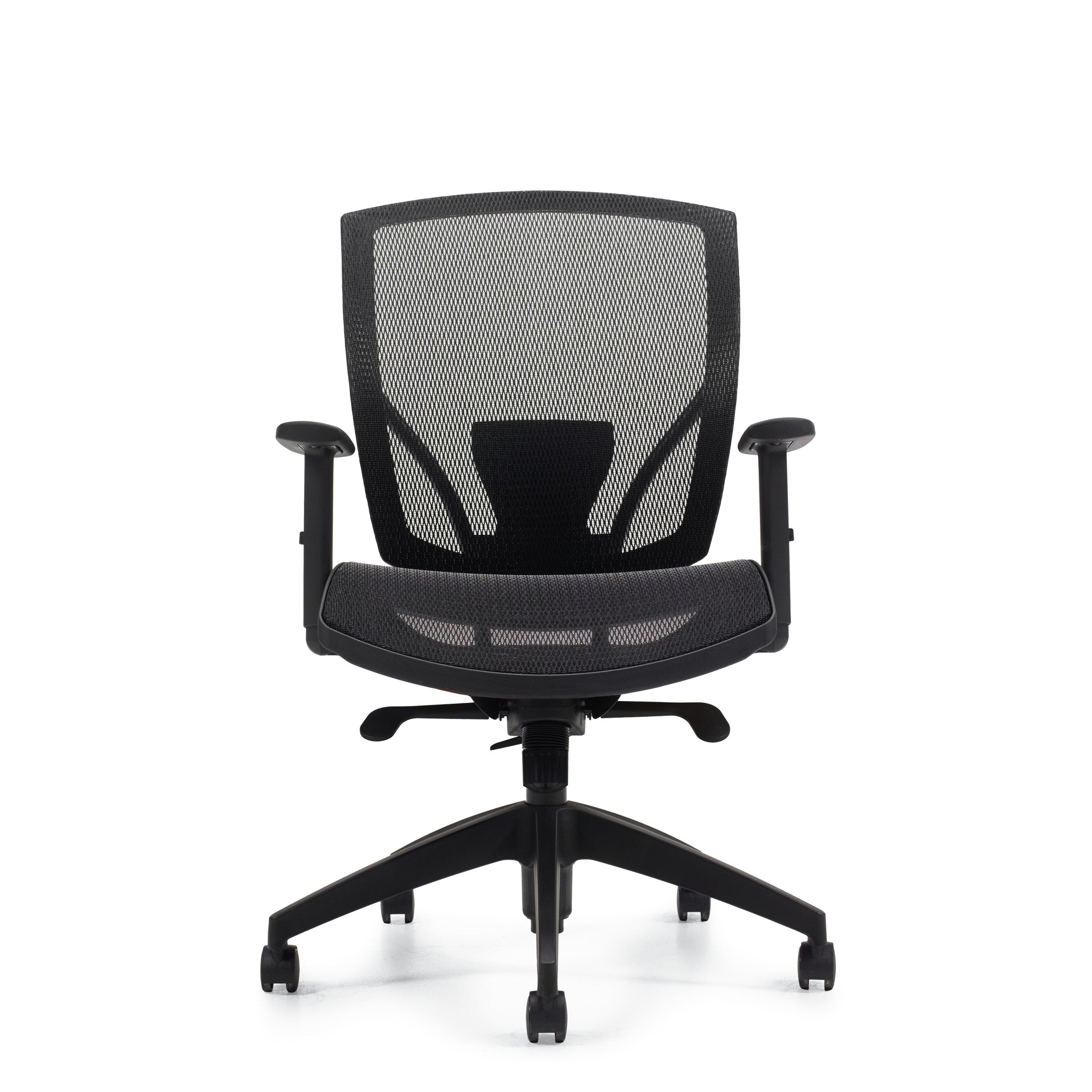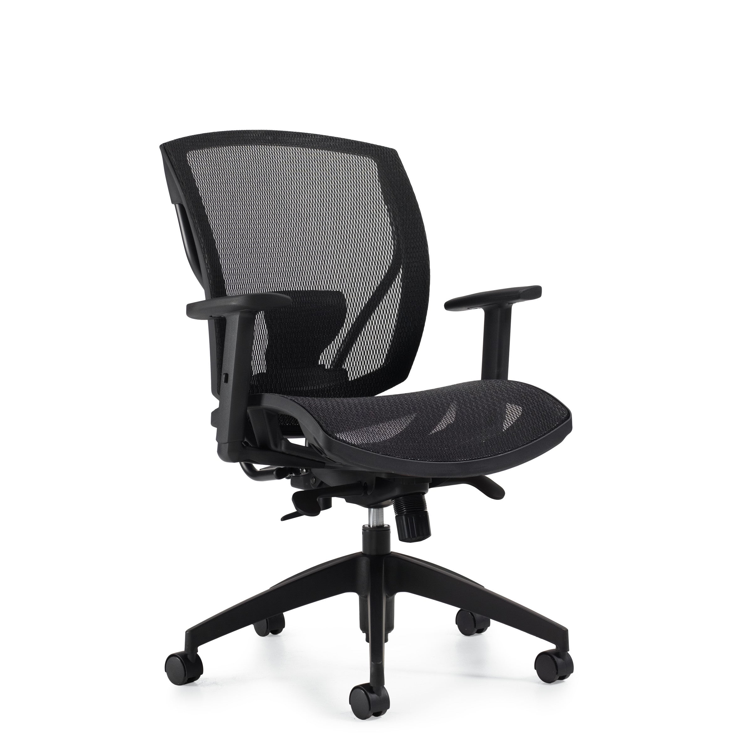 This ergonomically designed Black mesh back and seat chair features a pneumatic seat height adjustment, adjustable arms, multiple-position tilt lock with anti-kickback feature, adjustable seat depth, adjustable lumbar support, and a Synchro-tilt chair control with tilt tension adjustment. It also comes with twin wheel carpet casters for ease of use.