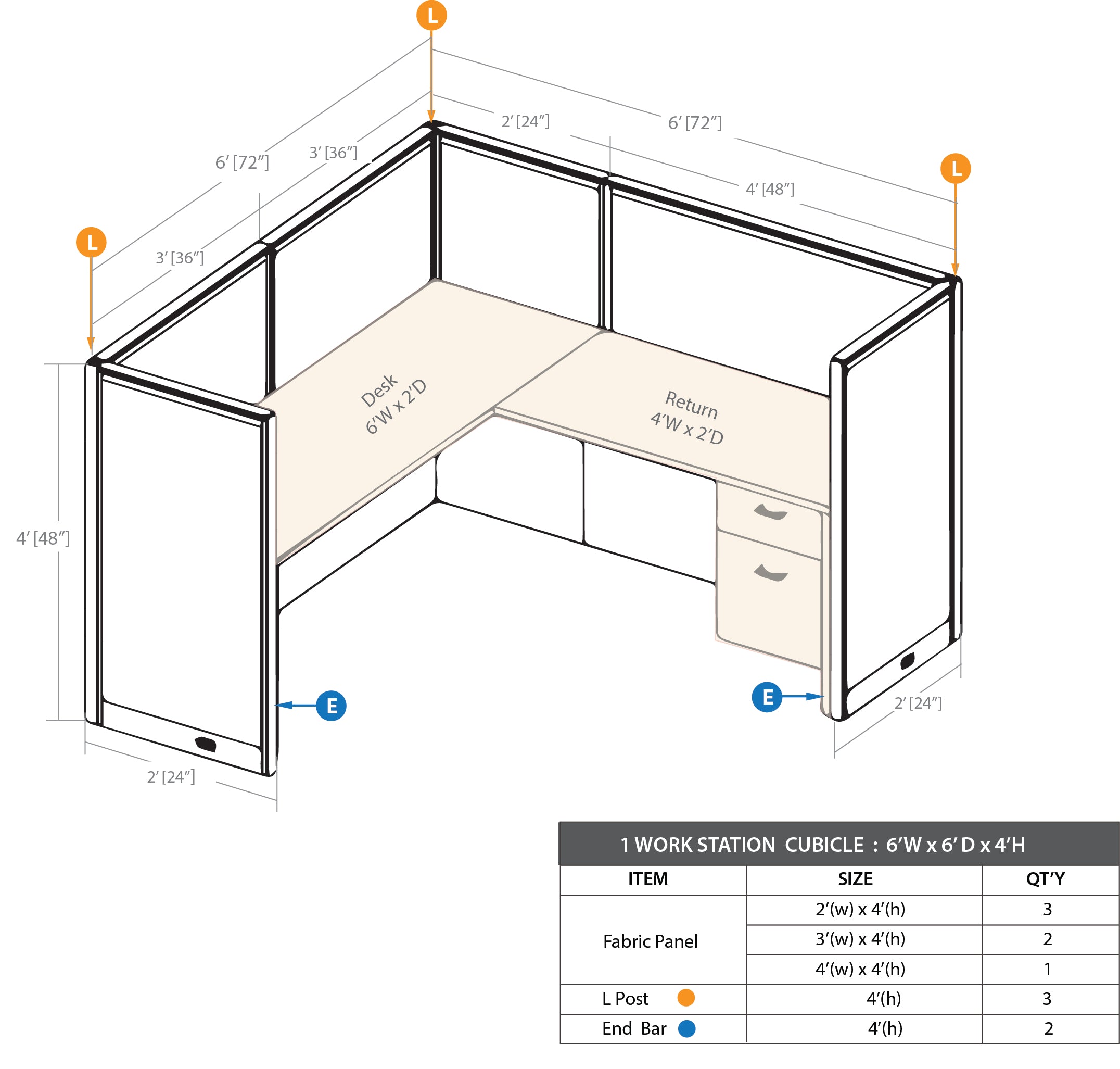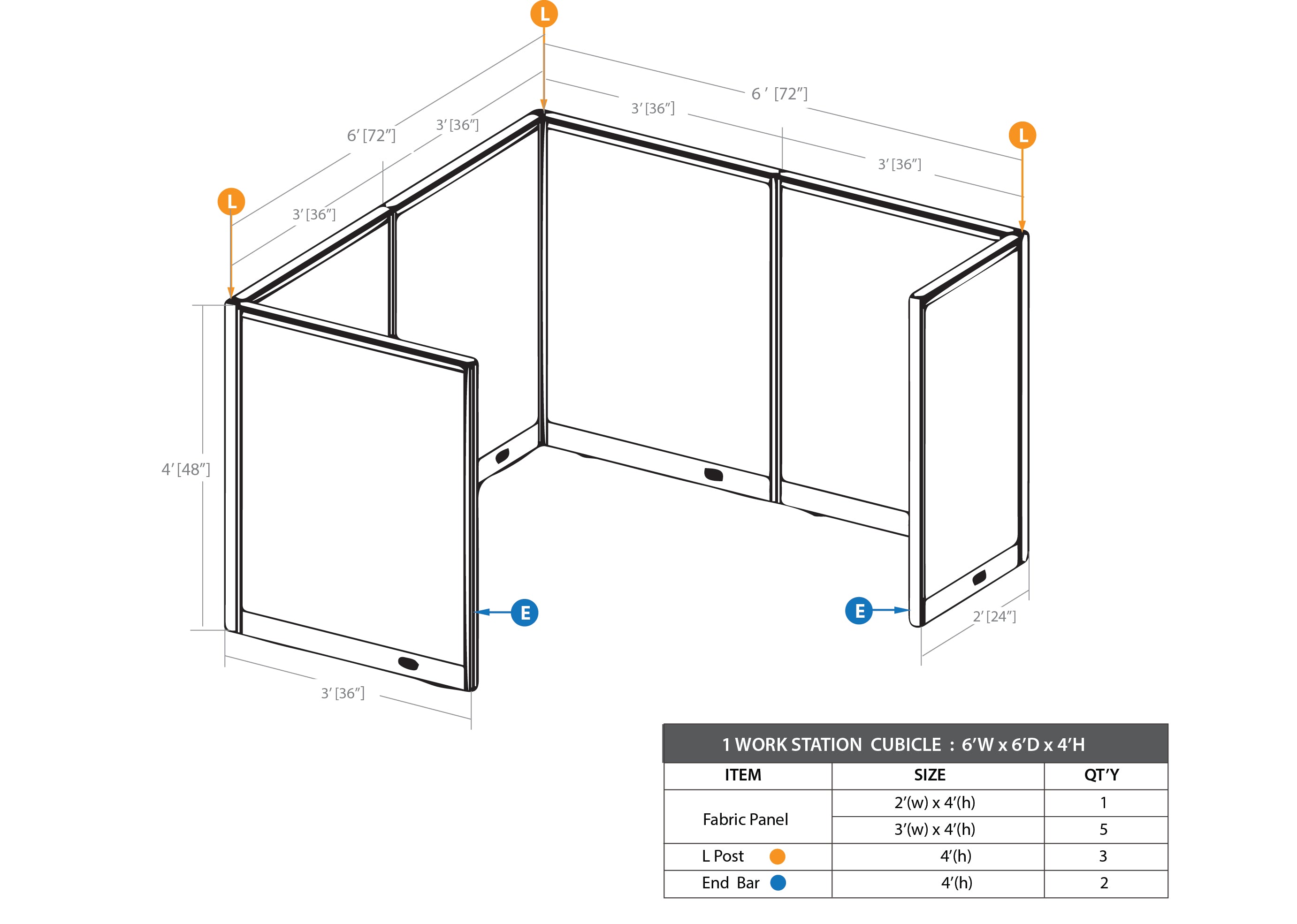 • The cubicle package includes 24”W panel(1), 36"W panels(5), End bars(2), L posts(3).