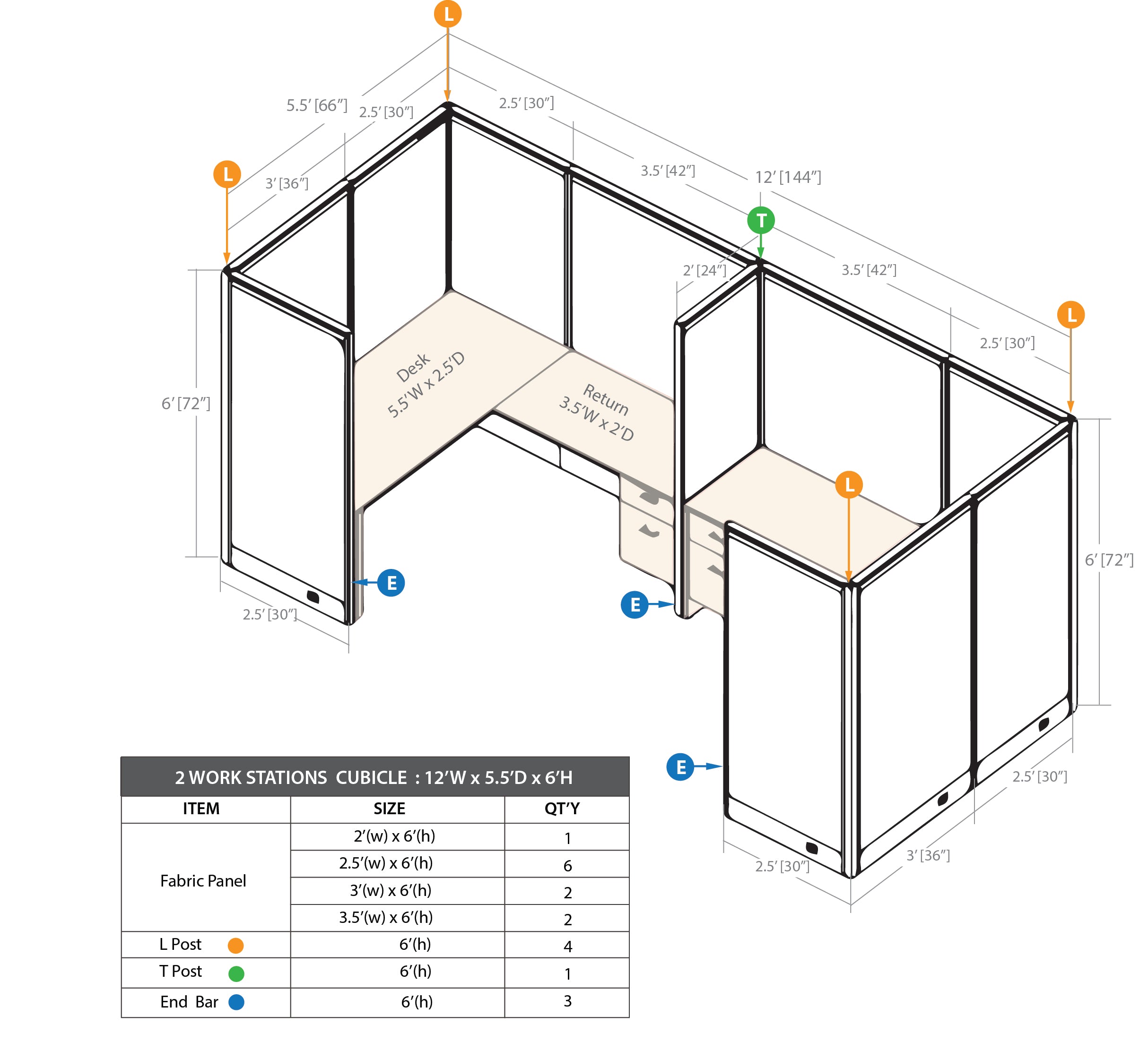 • The Cubicle with Desk Set includes 24"W panel(1), 30"W panels(6), 36"W panels(2), 42"W panels(2) End bars(3), T post(1), L posts(4), Rectangular Desk Shells(2), Returns(2) & Hanging box/file pedestals(2)
