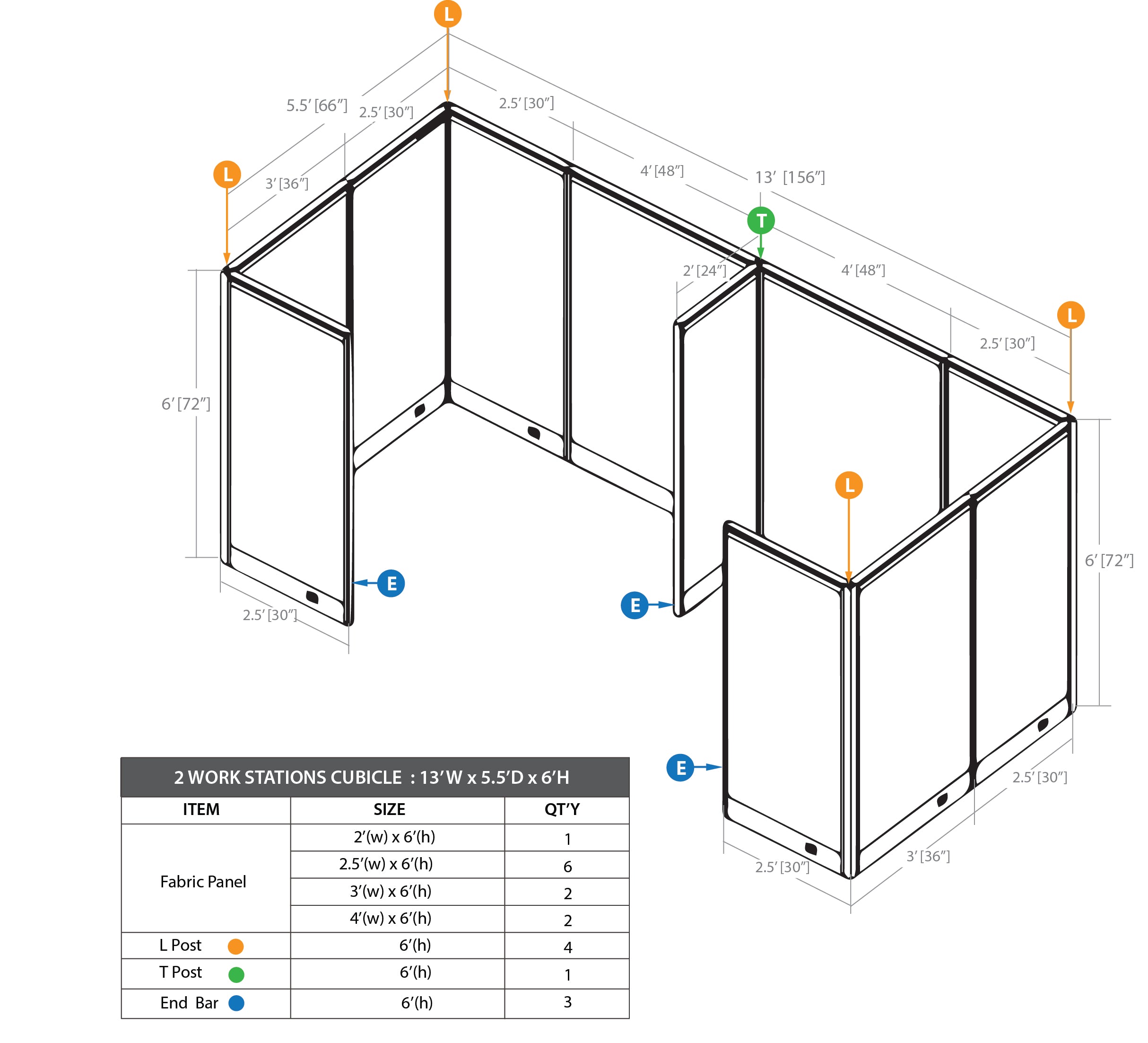• The cubicle package includes 24"W panel(1), 30"W panels(6), 36"W panels(2), 48"W panels(2), End bars(3), T post(1) & L posts(4).