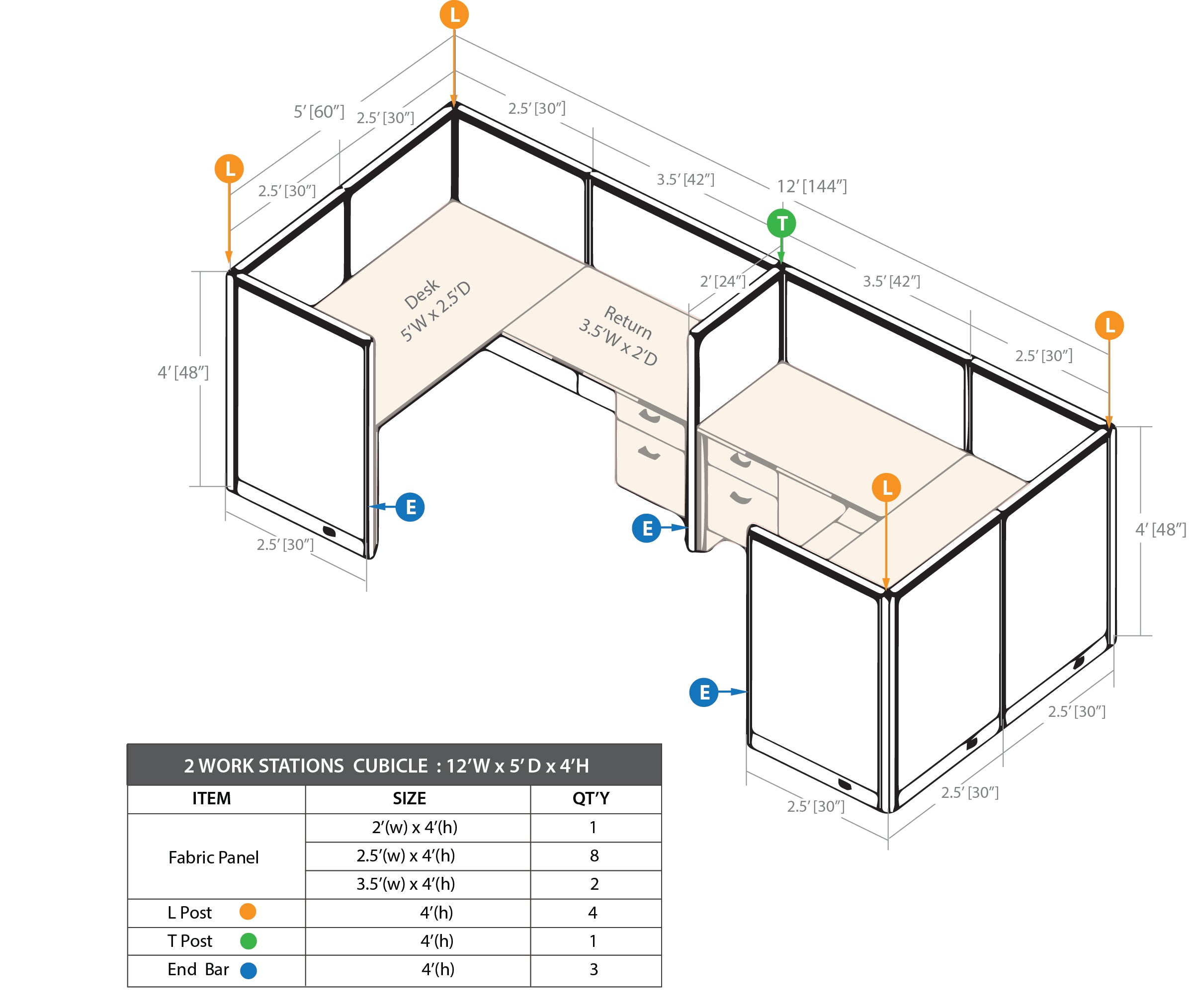 • The Cubicle with Desk Set includes 24”W panel(1), 30"W panels(8), 42"W panels(2) End bars(3), L posts(4), T post(1), Rectangular Desk Shells(2), Returns(2) & Hanging box/file pedestals(2)