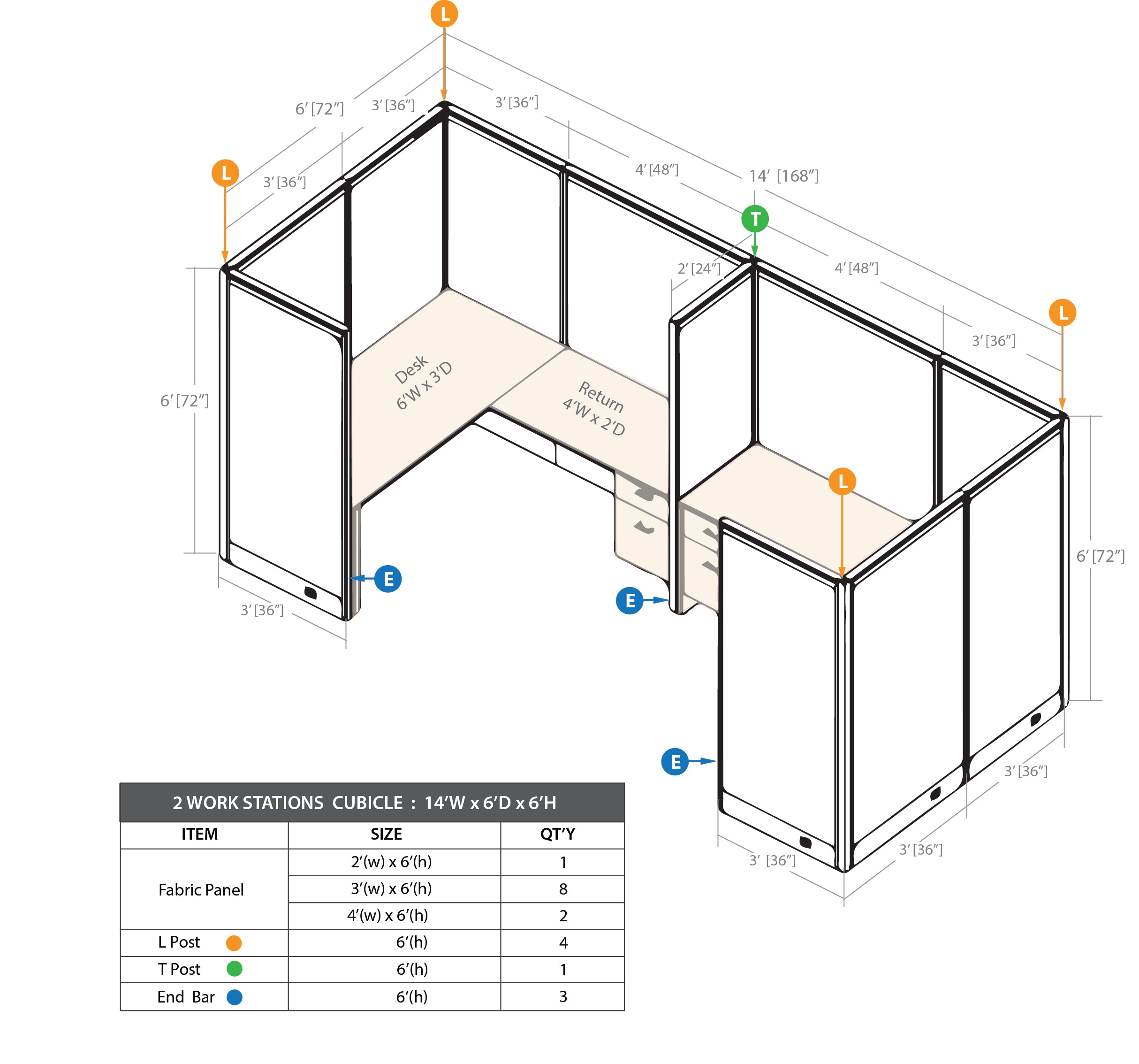 • The cubicle package includes 24”W panel(1), 36"W panels(8), 48"W panels(2), End bars(3), T post(1) & L posts(4).