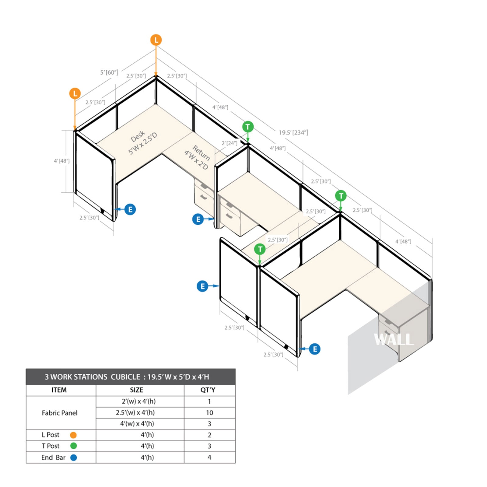 • The Cubicle with Desk Set includes 24"W panel(1), 30”W panels(8), 36"W panels(2), 48"W panels(3), End bars(4), T posts(3),  L posts(2), Rectangular Desk Shells(3), Returns(3) & Hanging box/file pedestals(3)