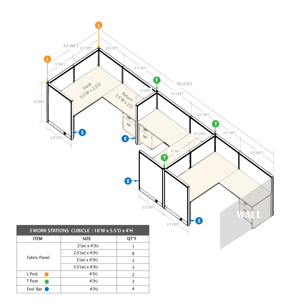 GOF 3 Person Separate Workstation Cubicle (5'D x 18'W x 4'H -W)