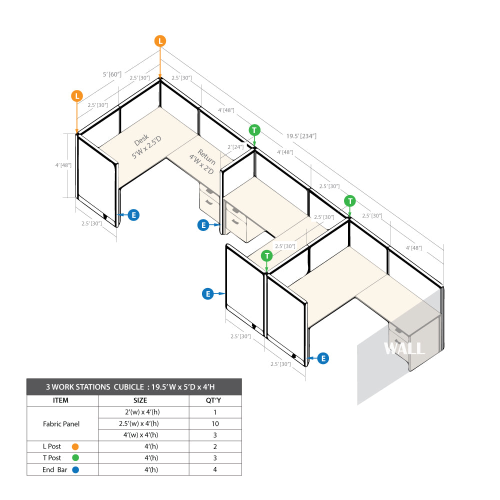 • The Cubicle with Desk Set includes 24"W panel(1), 30"W panels(10), 48"W panels(3), End bars(4), T posts(3),  L posts(2), Rectangular Desk Shells(3), Returns(3) & Hanging box/file pedestals(3)