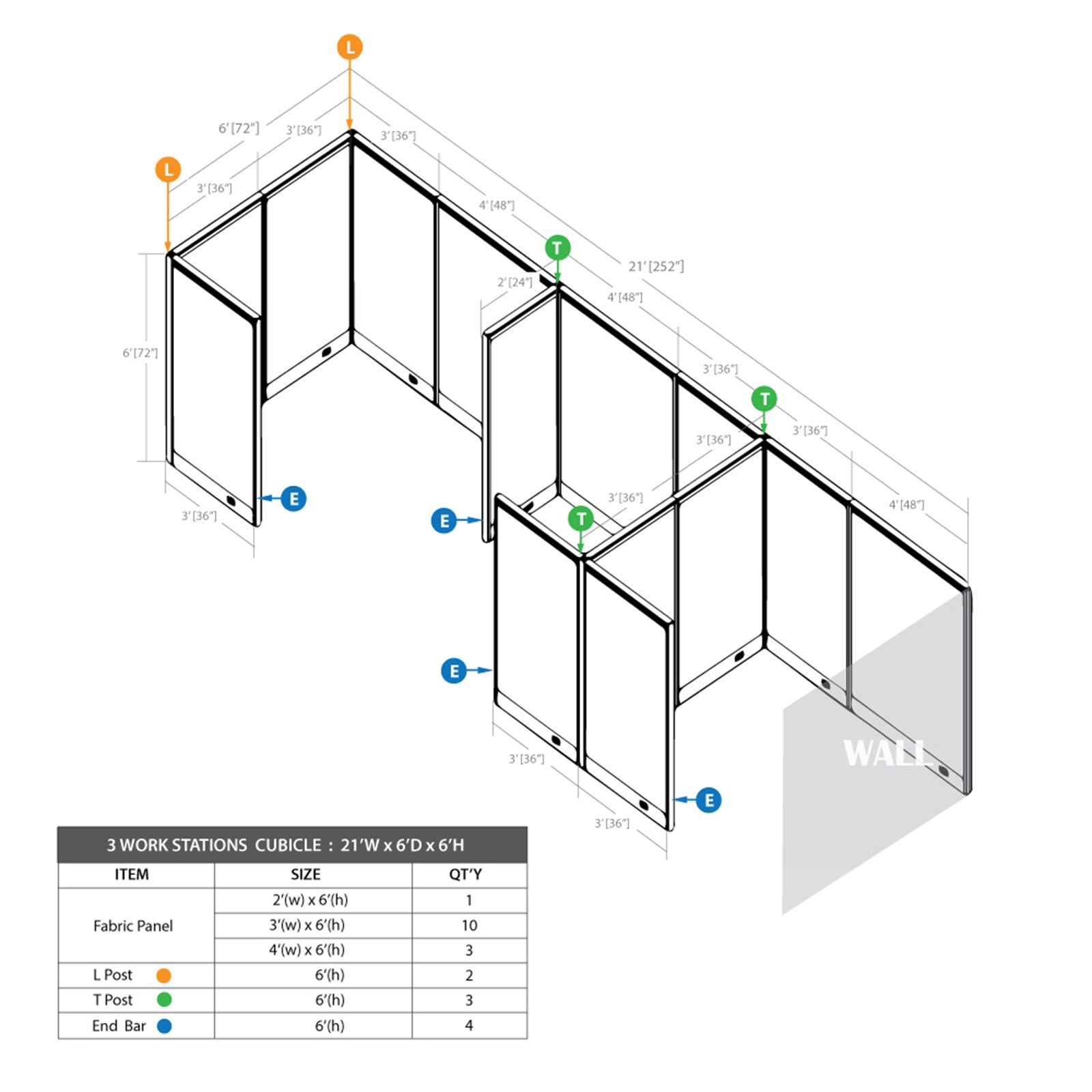 • The cubicle package includes 24"W panel(1), 36"W panels(10), 48"W panels(3), End bars(4), T posts(3) & L posts(2).