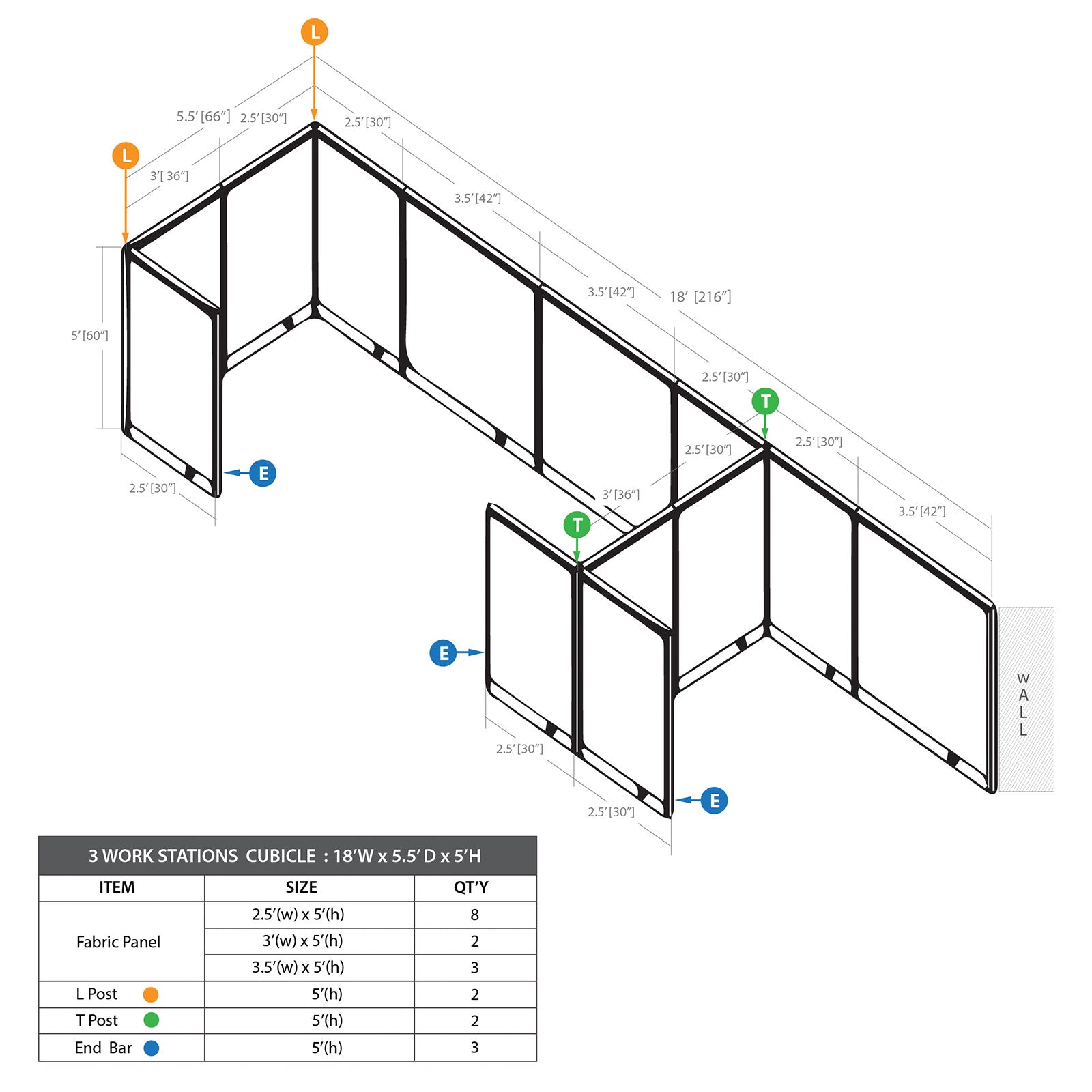 GOF 3 Person Workstation Cubicle (5.5'D  x 18'W x 5'H)