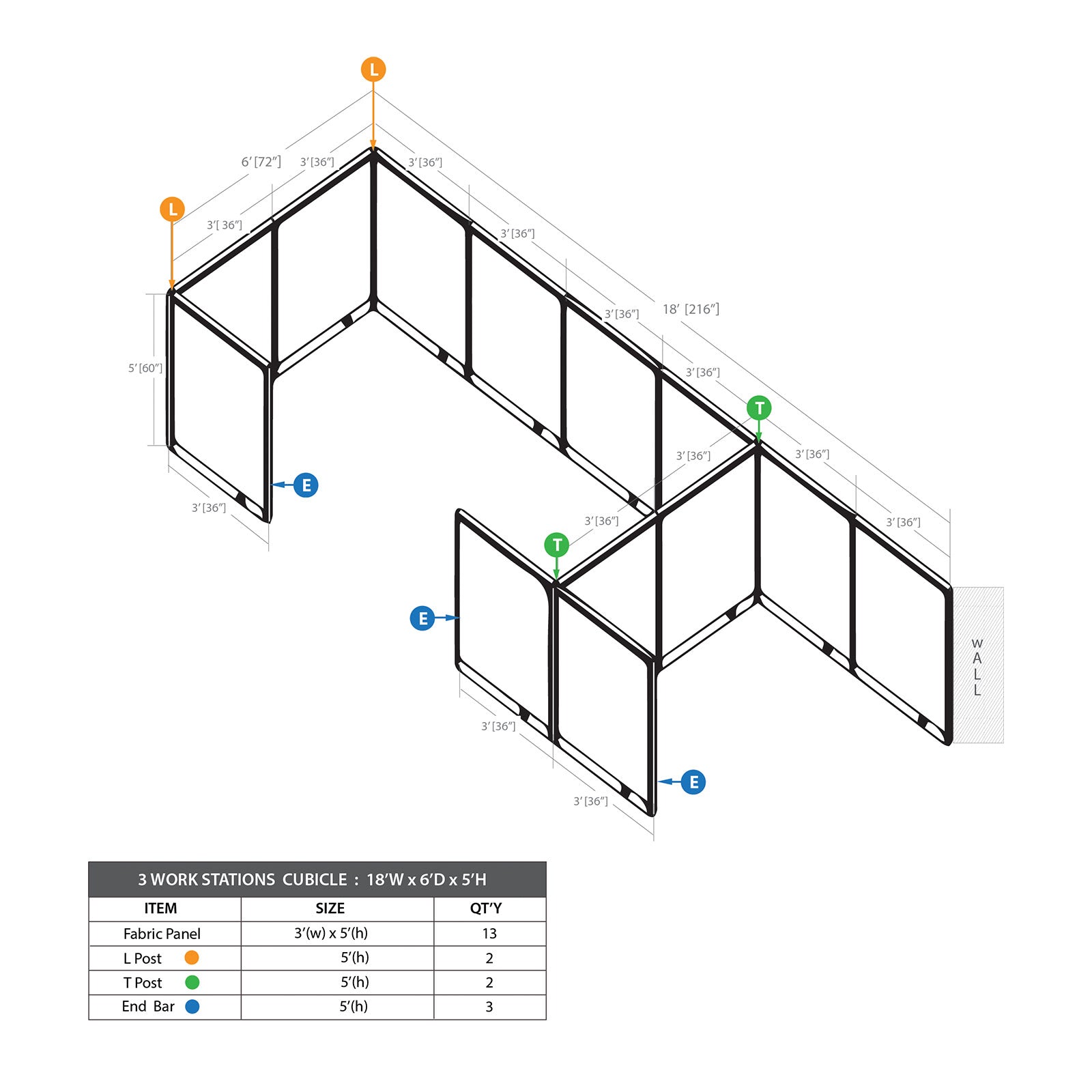 GOF 3 Person Workstation Cubicle (6'D  x 18'W x 5'H) / Office Partition, Room Divider - Kainosbuy.com