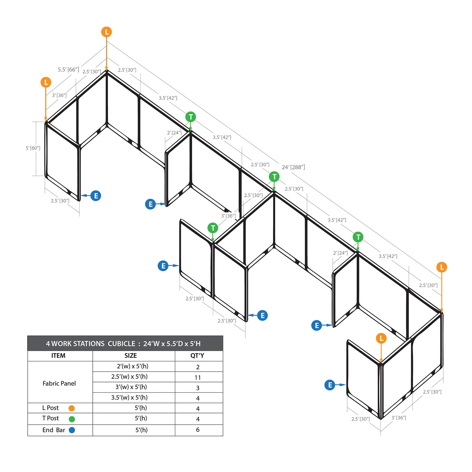 • The cubicle package includes 24"W panels(2), 30"W panels(11), 36"W panels(3), 42"W panels(4), End bars(6), T posts(4) & L posts(4).