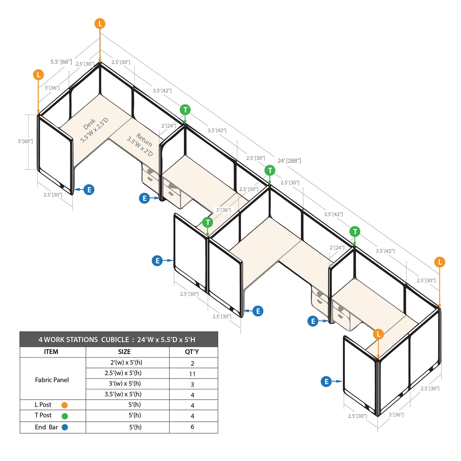 • The Cubicle with Desk Set includes 24"W panels(2), 30"W panels(11), 36"W panels(3), 42"W panels(4), End bars(6), T posts(4),  L posts(4), Rectangular Desk Shells(4), Returns(4) & Hanging box/file pedestals(4)