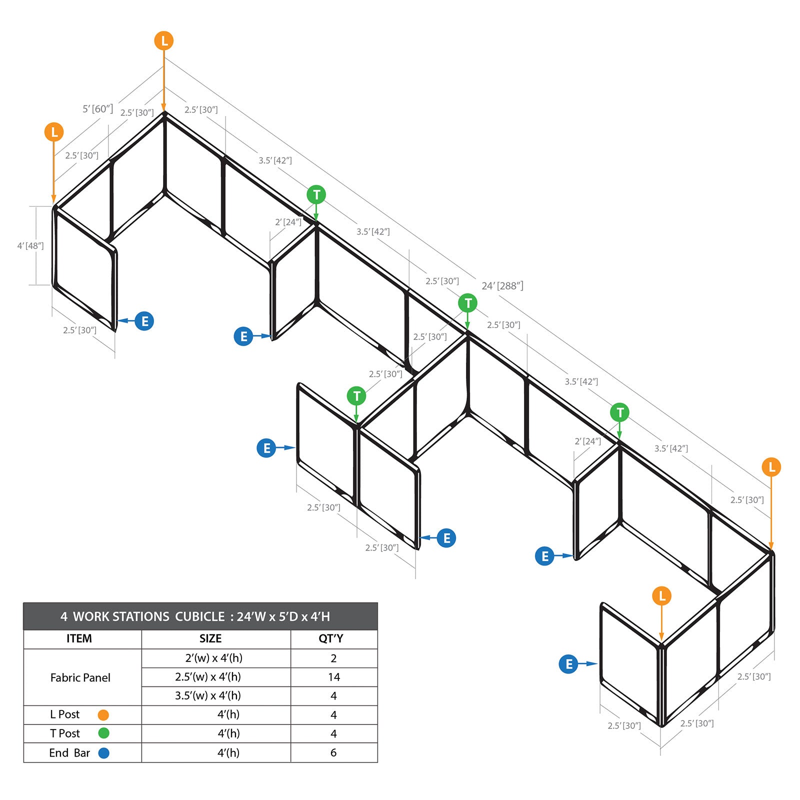 • The cubicle package includes 24"W panels(2), 30"W panels(14), 42"W panels(4), End bars(6), T posts(4) & L posts(4).
