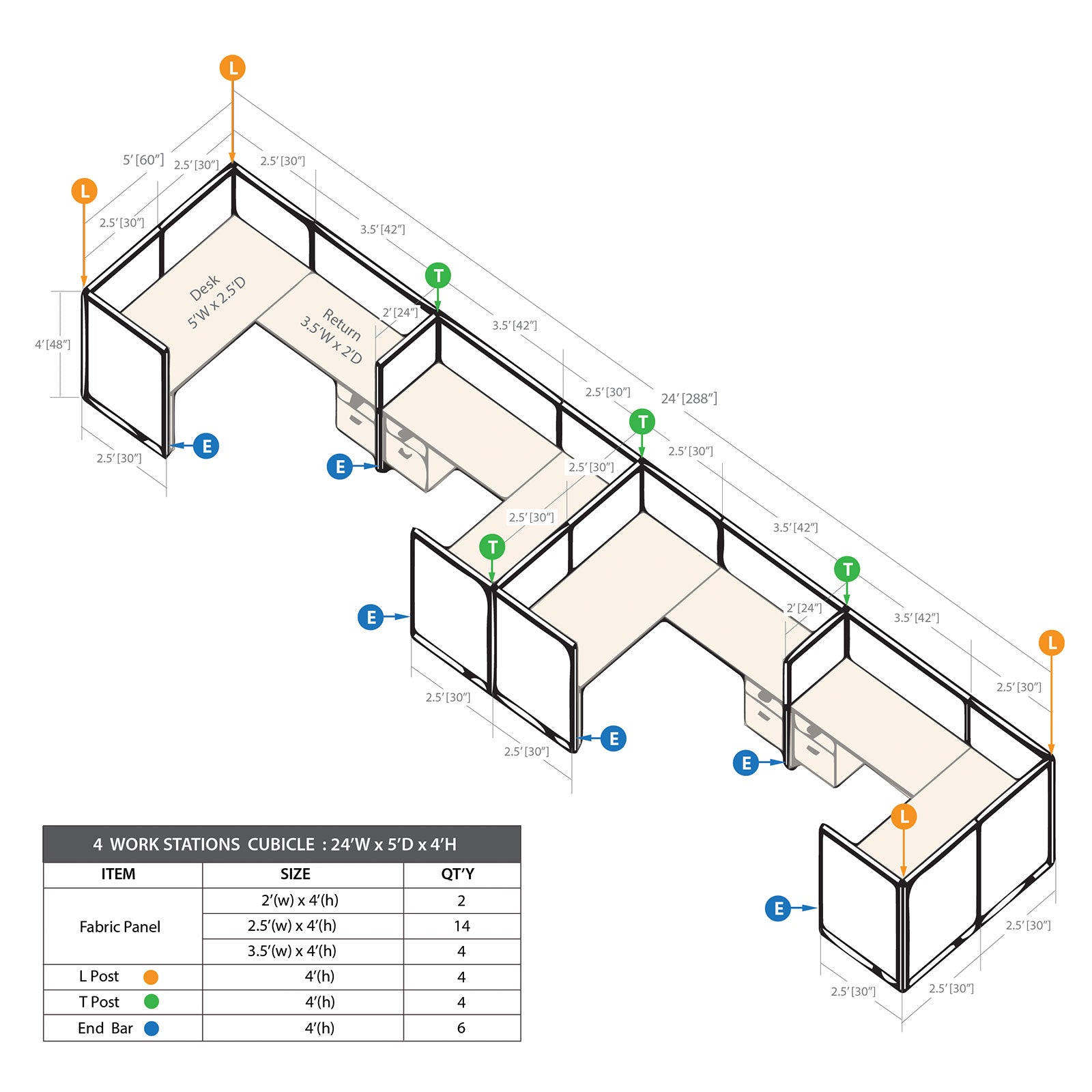 • The Cubicle with Desk Set includes 24"W panels(2), 30"W panels(14), 42"W panels(4), End bars(6), T posts(4),  L posts(4), Rectangular Desk Shells(4), Returns(4) & Hanging box/file pedestals(4)