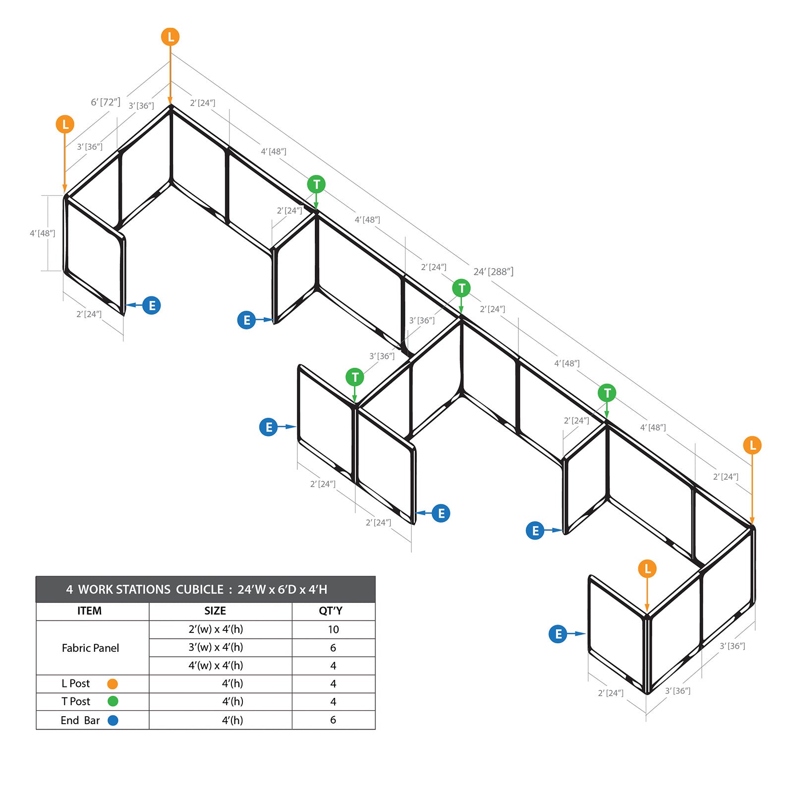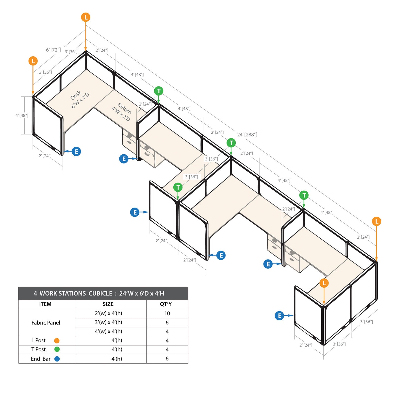 GOF 4 Person Separate Workstation Cubicle (C-6'D x 24'W x 4'H -W)