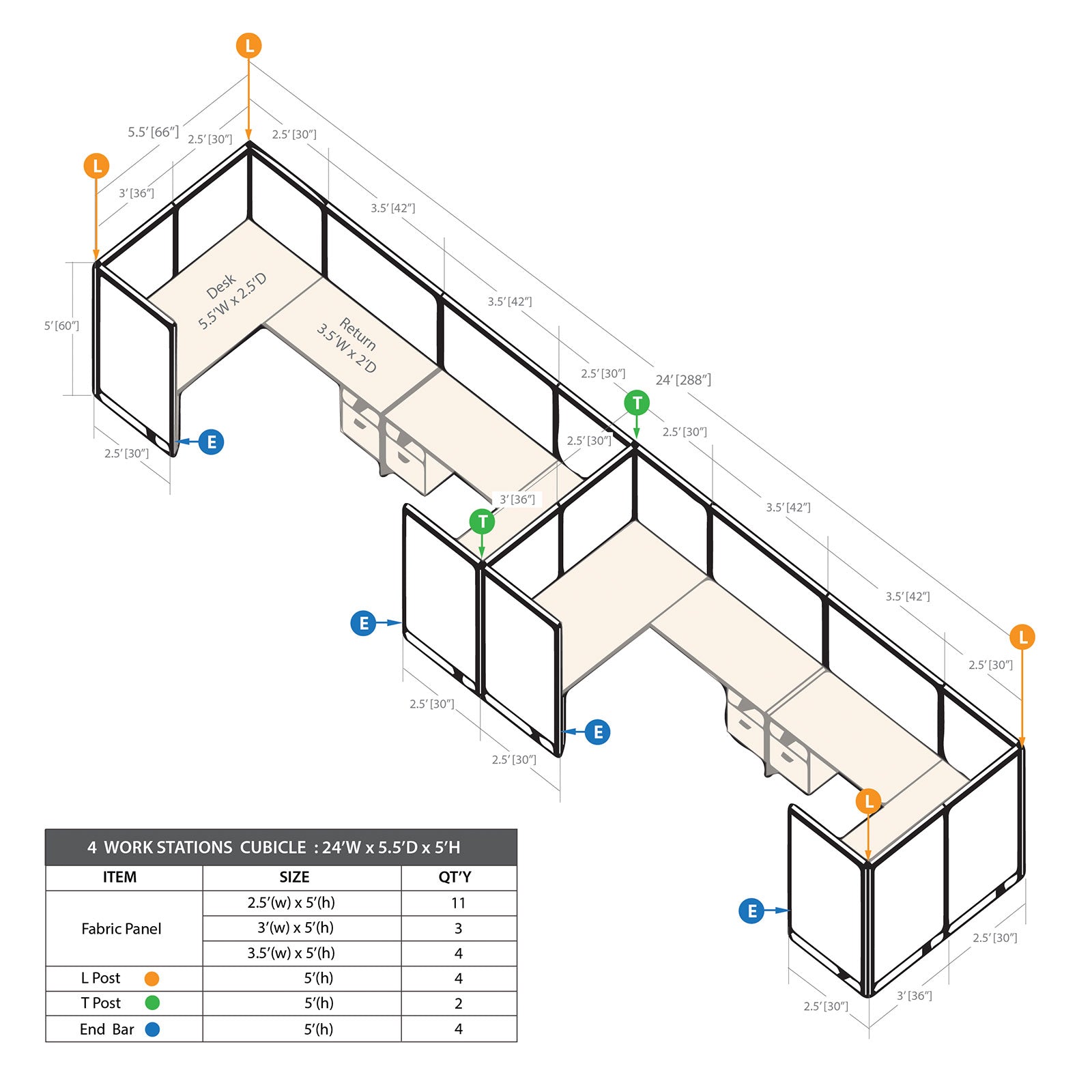 • The Cubicle with Desk Set includes 30"W panels(11), 36"W panels(3), 42"W panels(4), End bars(4), T posts(2),  L posts(4), Rectangular Desk Shells(4), Returns(4) & Hanging box/file pedestals(4)
