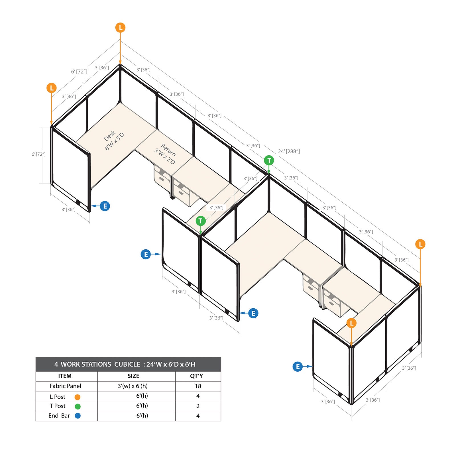 GOF 4 Person Workstation Cubicle (6'D  x 24'W x 6'H) / Office Partition, Room Divider - Kainosbuy.com