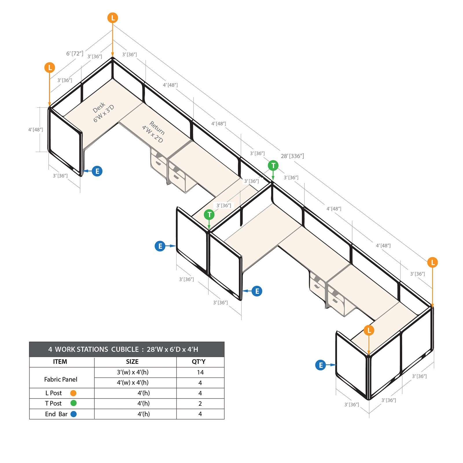 GOF 4 Person Workstation Cubicle (6'D  x 28'W x 4'H) / Office Partition, Room Divider - Kainosbuy.com