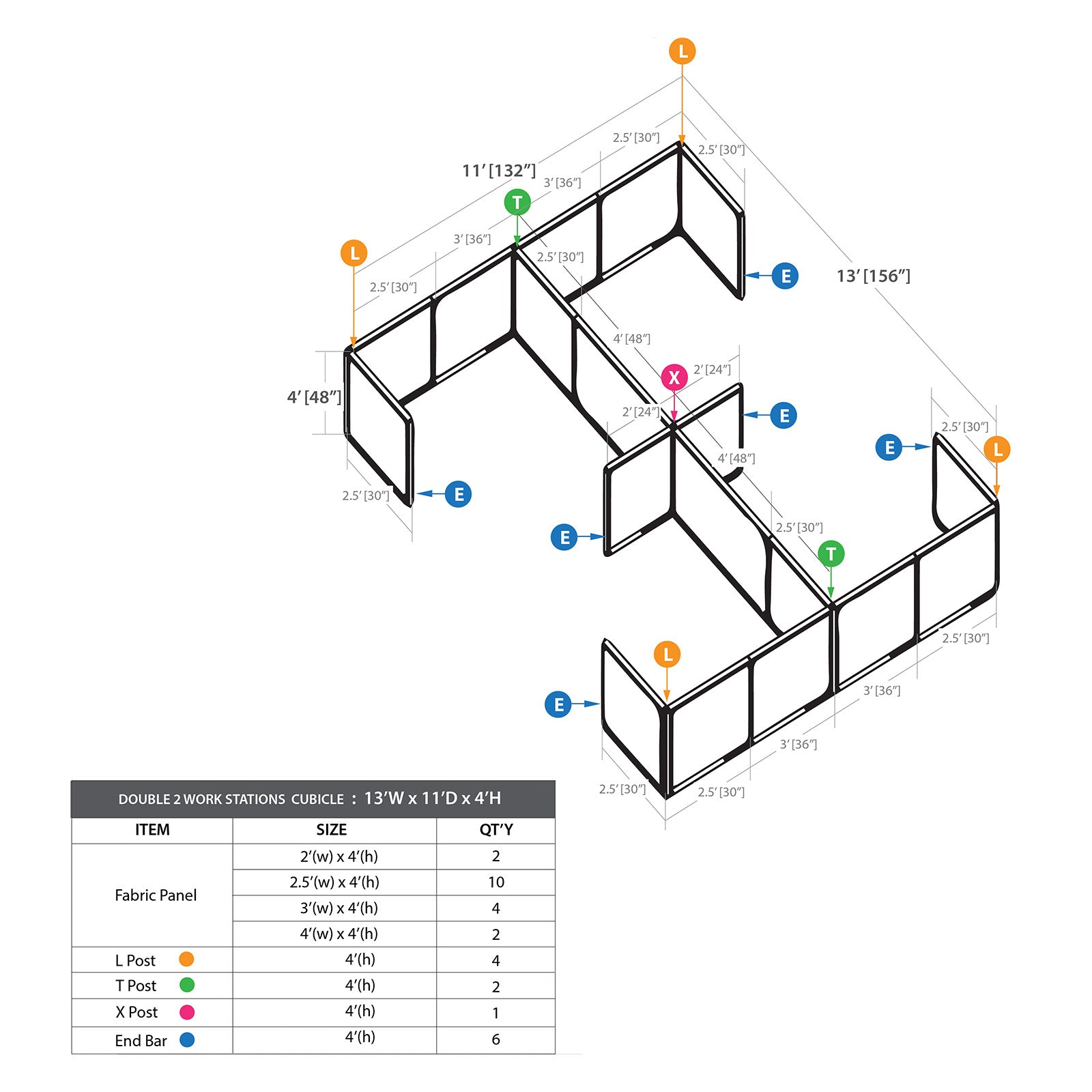 • The cubicle package includes 24"W panels(2), 30"W panels(10), 36"W panels(4), 48"W panels(2), End bars(6), X post(1), T posts(2) & L posts(4).