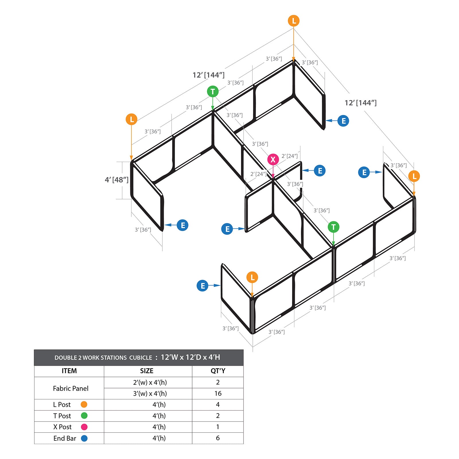GOF Double 4 Person Separate Workstation Cubicle (12'D x 12'W x 4'H-W) / Office Partition, Room Divider - Kainosbuy.com