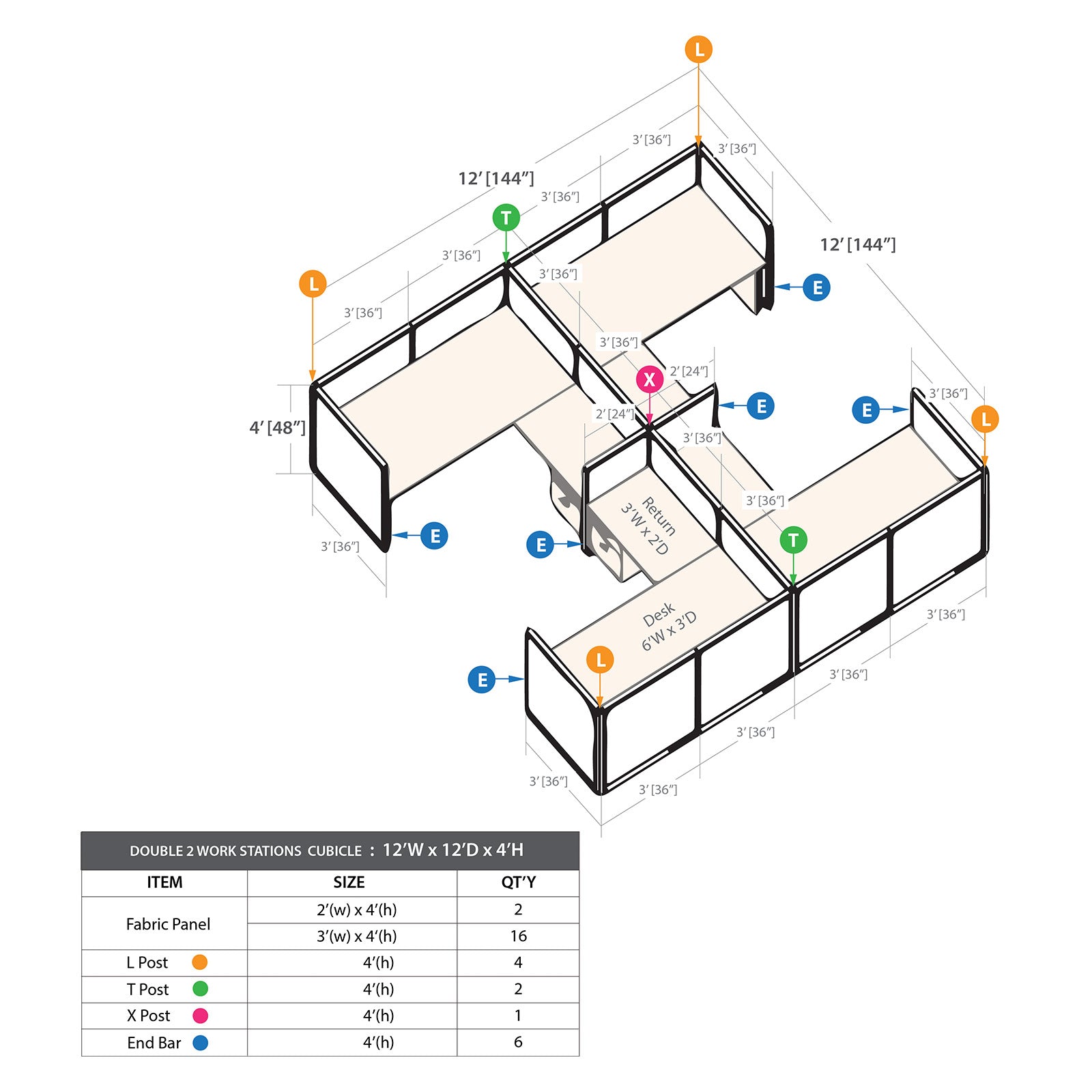 GOF Double 4 Person Separate Workstation Cubicle (12'D x 12'W x 4'H-W)