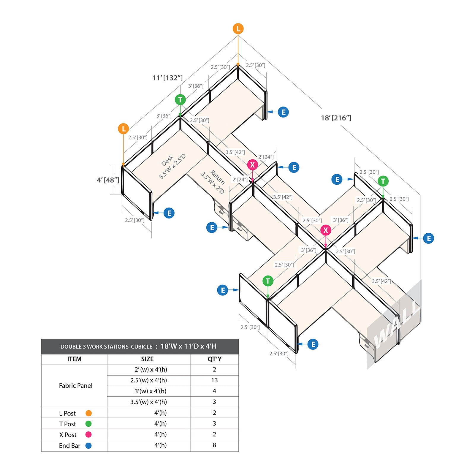 • The Cubicle with Desk Set includes 24"W panels(2), 30"W panels(13), 36"W panels(4), 42"W panels(3), End bars(8), X post(2), T posts(3),  L posts(2), Rectangular Desk Shells(6), Returns(6) & Hanging box/file pedestals(6)