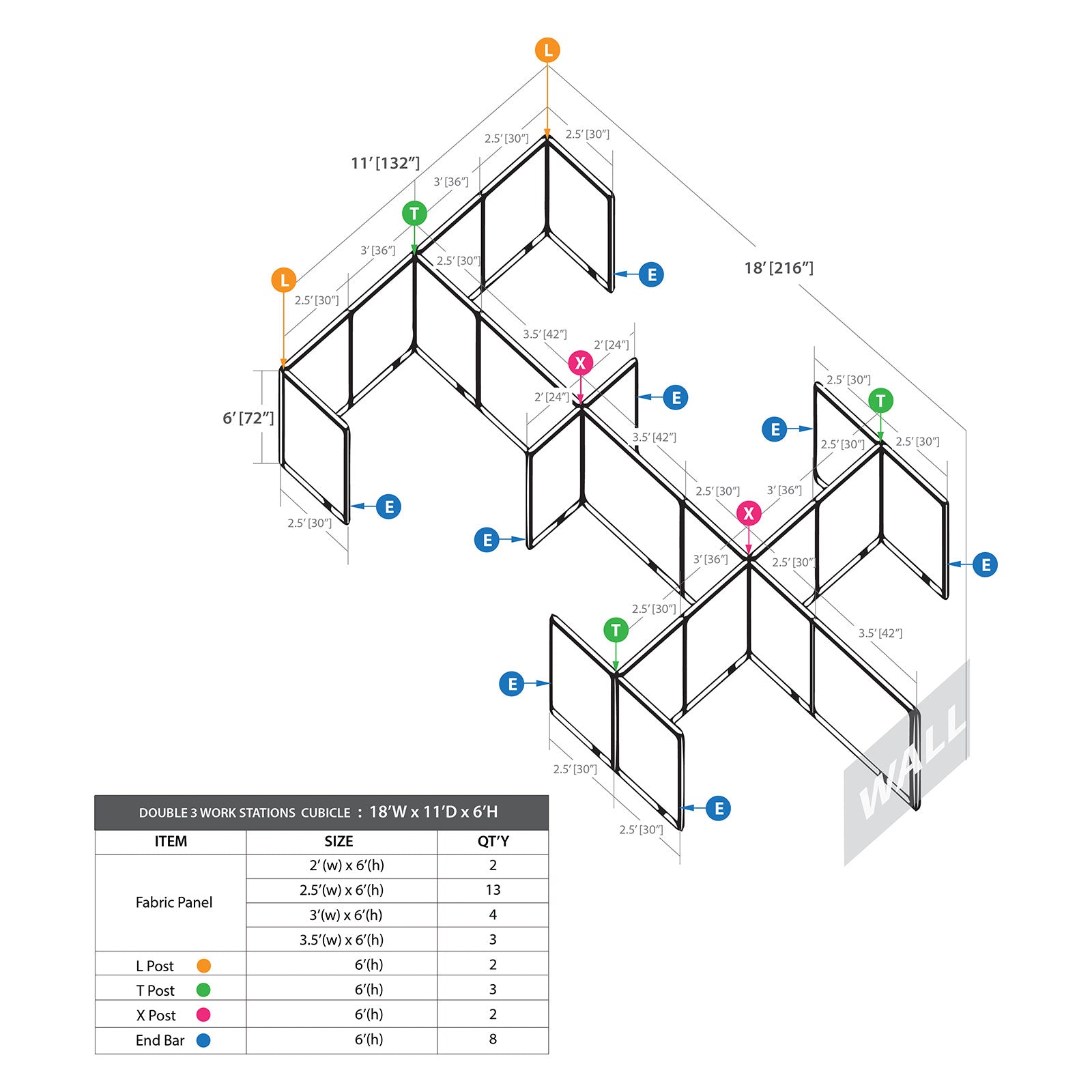 GOF Double 6 Person Separate Workstation Cubicle (11'D x 18'W x 6'H-W)