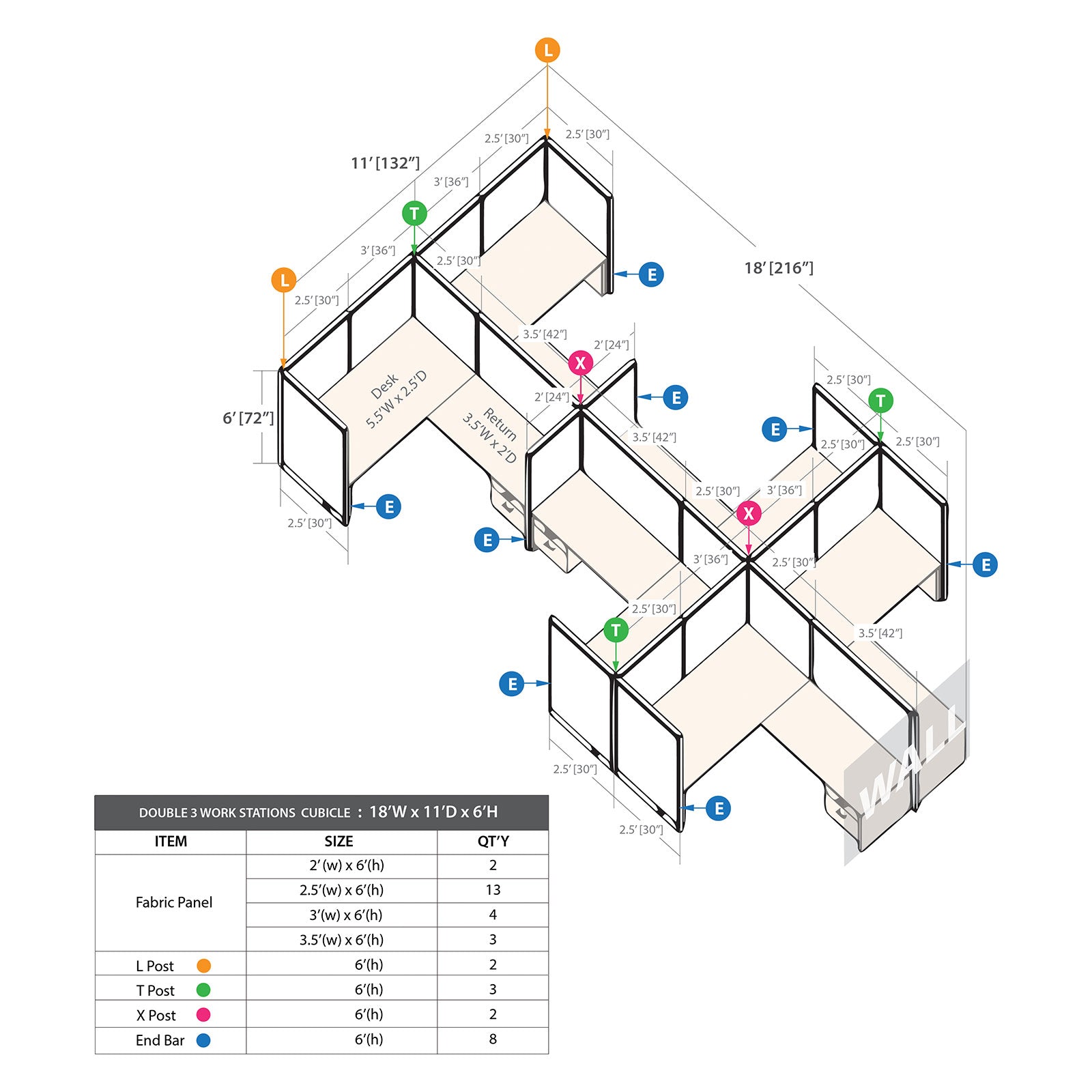Home GOF Double 6 Person Separate Workstation Cubicle (11'D x 18'W x 6'H-W)