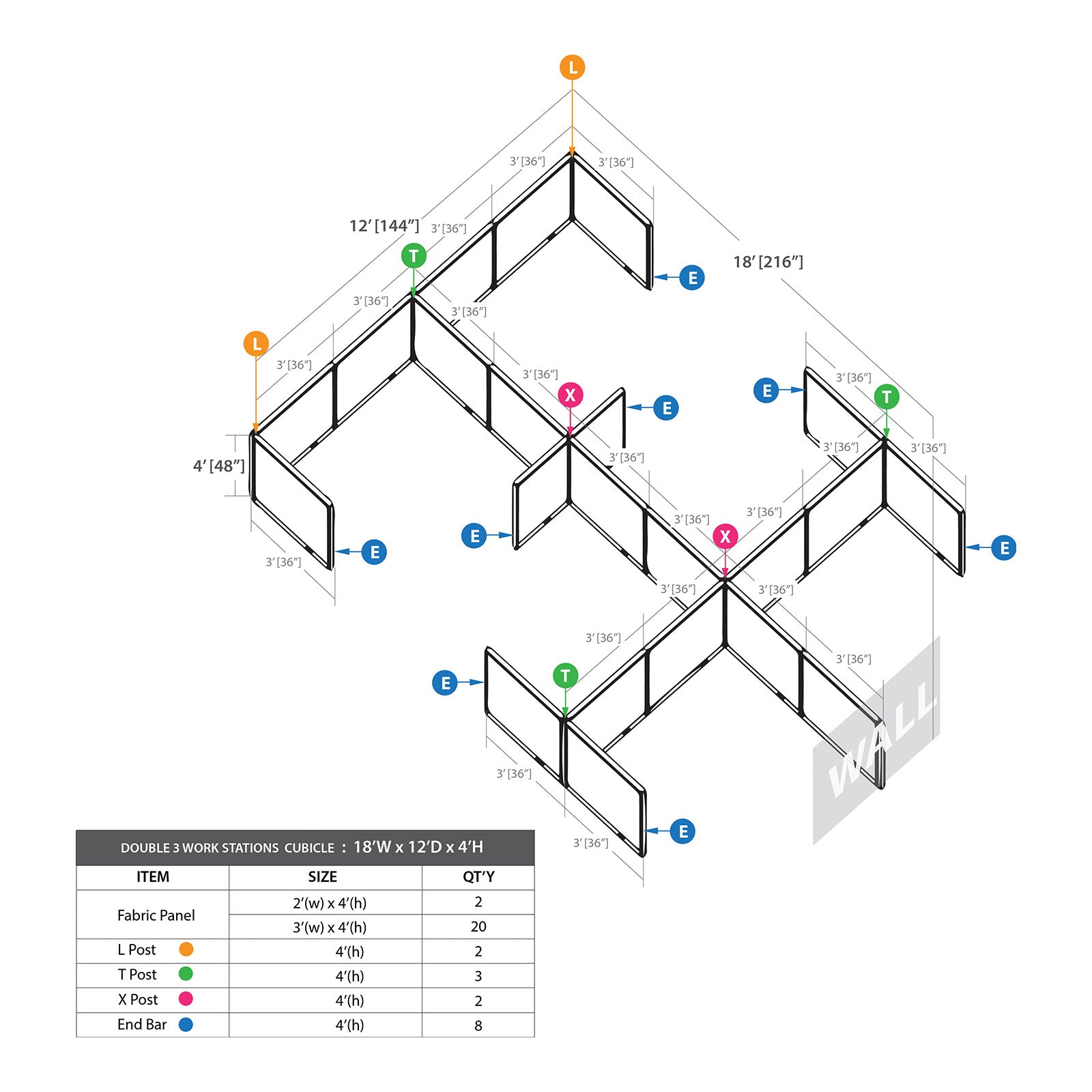 GOF Double 6 Person Separate Workstation Cubicle (12'D x 18'W x 4'H-W) / Office Partition, Room Divider - Kainosbuy.com