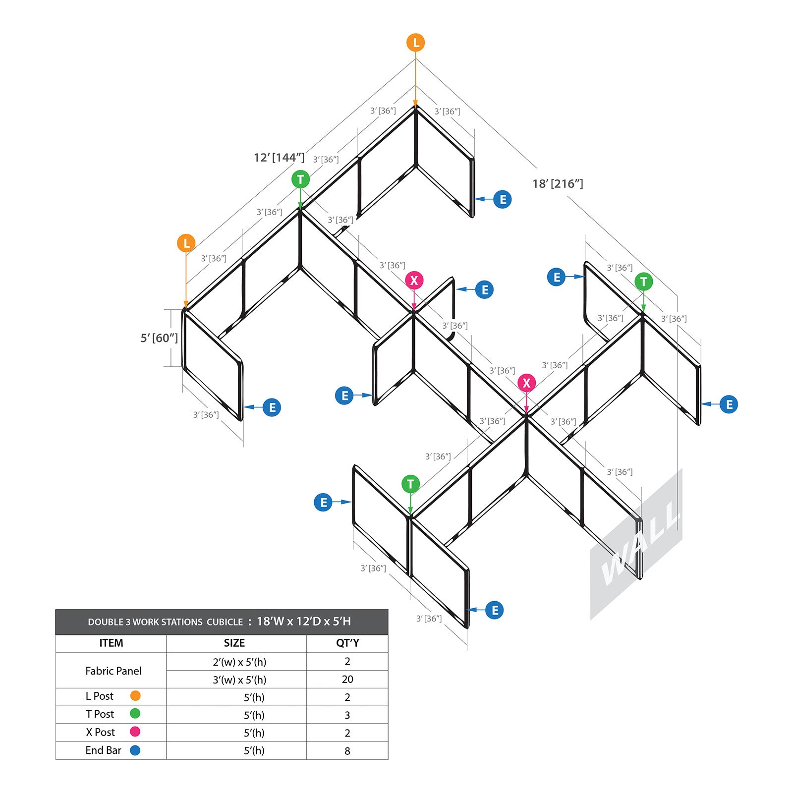 • The cubicle package includes 24"W panels(2), 36"W panels(20), End bars(8), X post(2), T posts(3) & L posts(2).