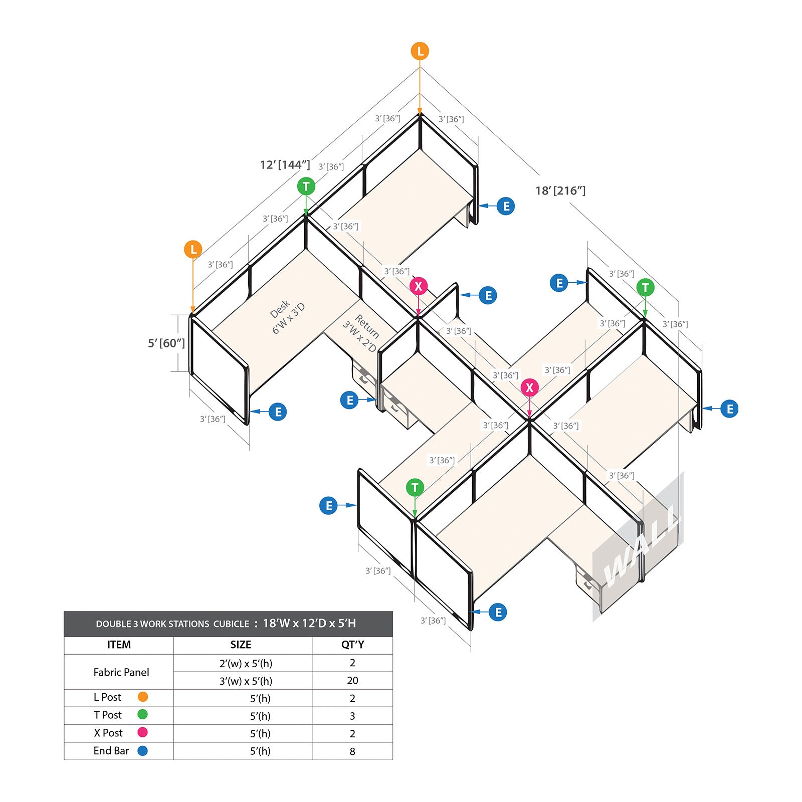 • The Cubicle with Desk Set includes 24"W panels(2), 36"W panels(20), End bars(8), X post(2), T posts(3),  L posts(2), Rectangular Desk Shells(6), Returns(6) & Hanging box/file pedestals(6)