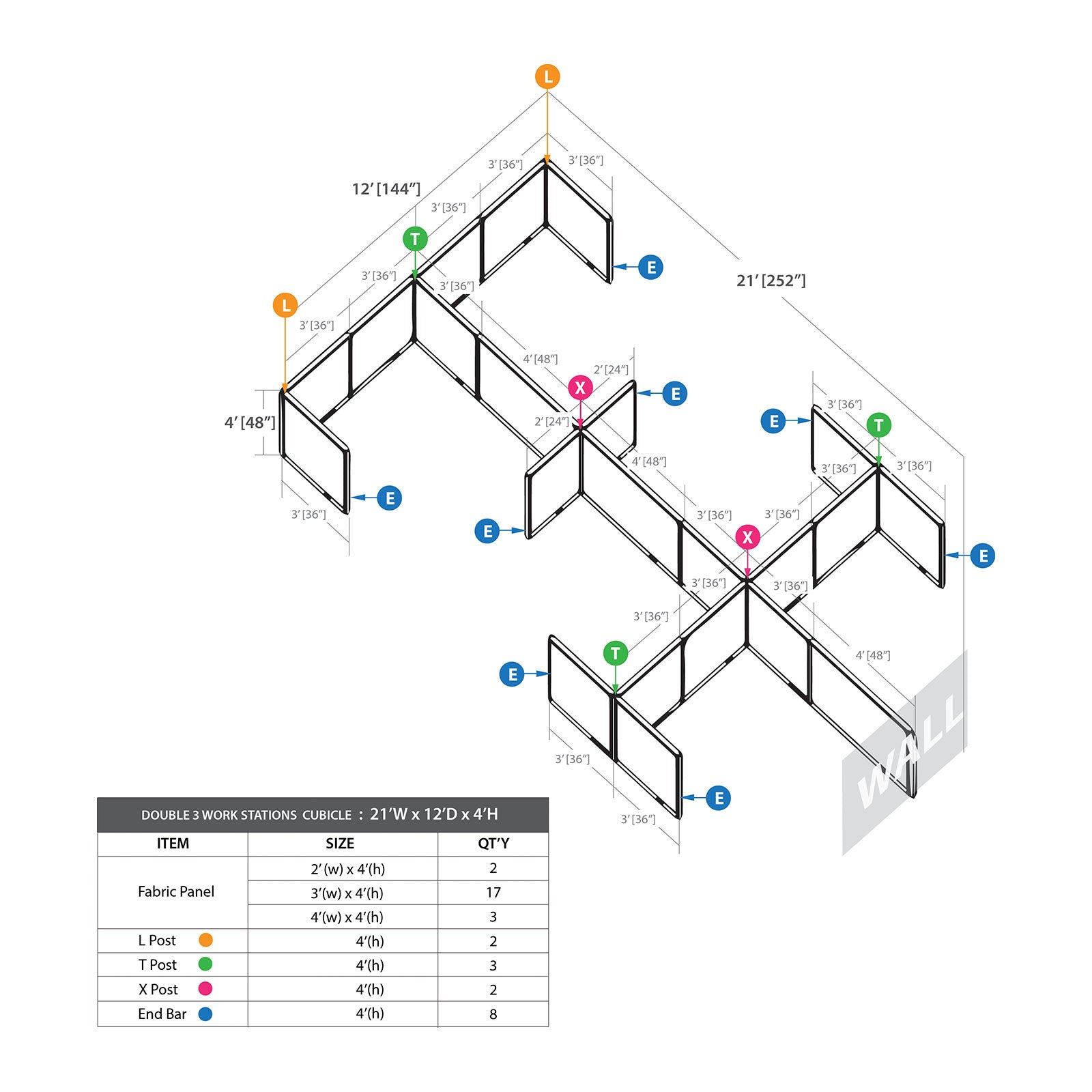 GOF Double 6 Person Separate Workstation Cubicle (12'D x 21'W x 4'H-W) / Office Partition, Room Divider - Kainosbuy.com