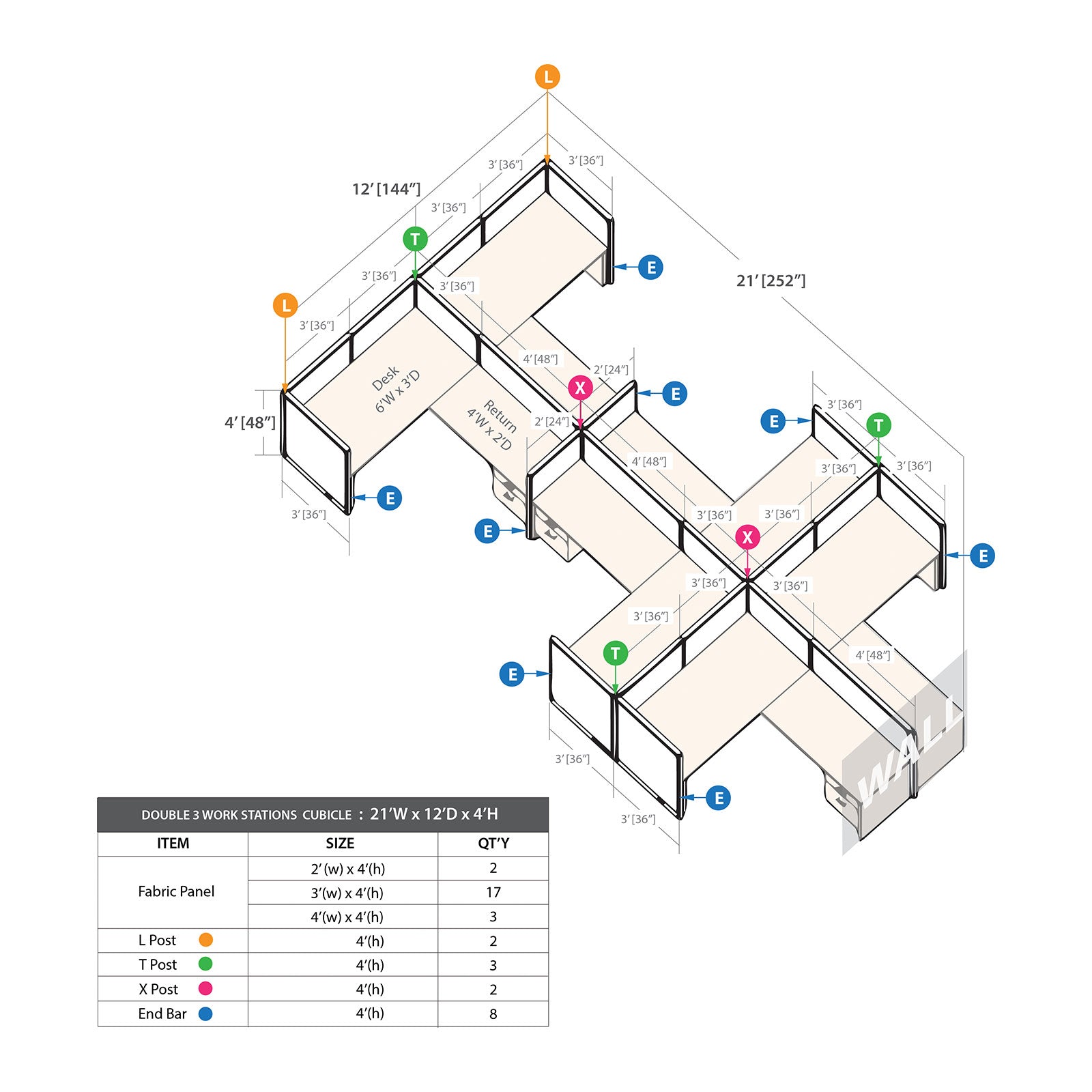 • The Cubicle with Desk Set includes 24"W panels(2), 36"W panels(17), 48"W panels(3), End bars(8), X post(2), T posts(3),  L posts(2), Rectangular Desk Shells(6), Returns(6) & Hanging box/file pedestals(6)