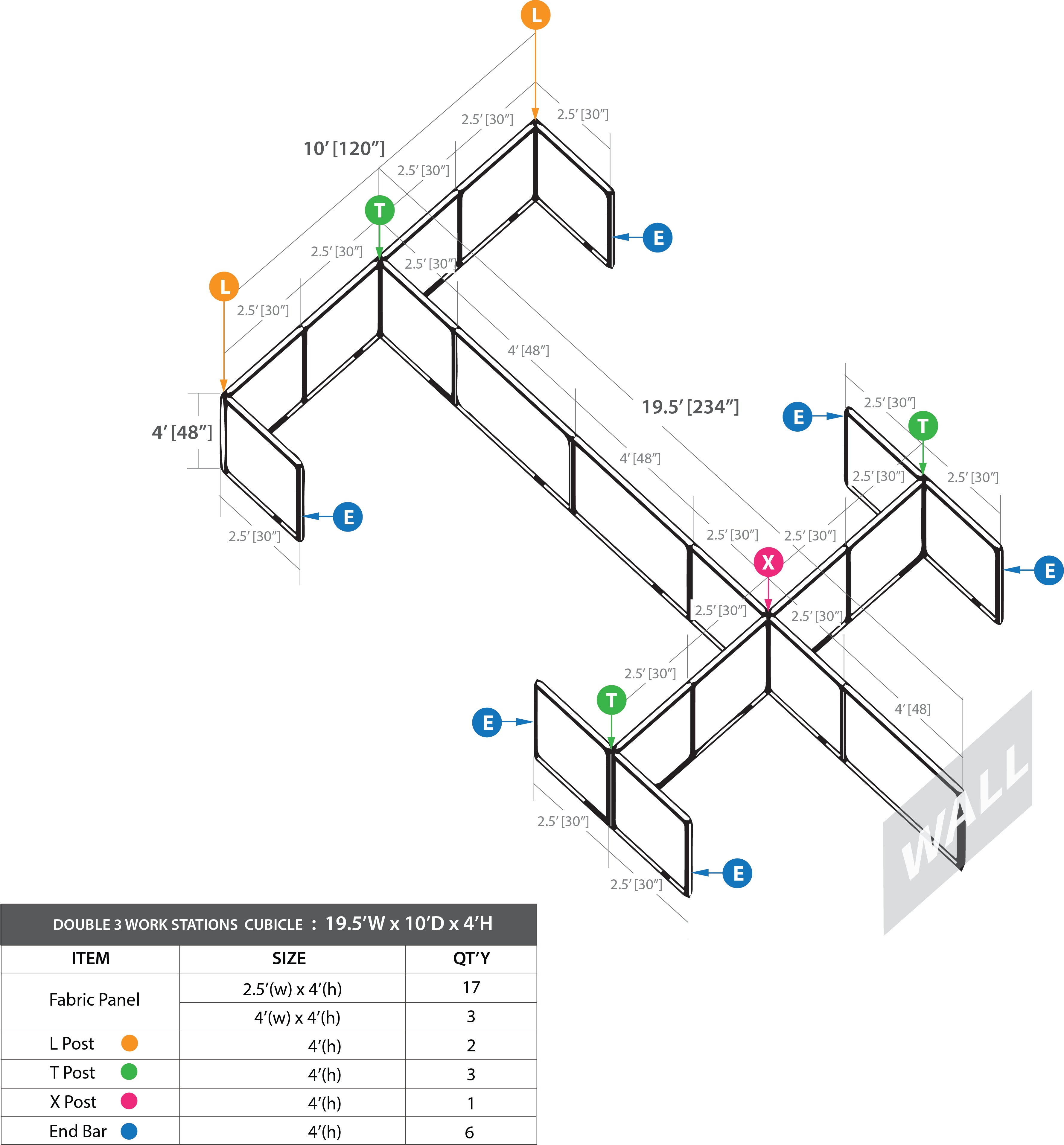 • The cubicle package includes 30"W panels(17), 48"W panels(3), End bars(6), X post(1), T posts(3) & L posts(2).