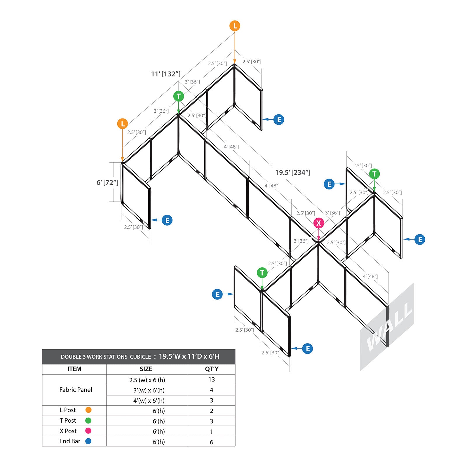 GOF Double 6 Person Workstation Cubicle (11'D x 19.5'W x 6'H)