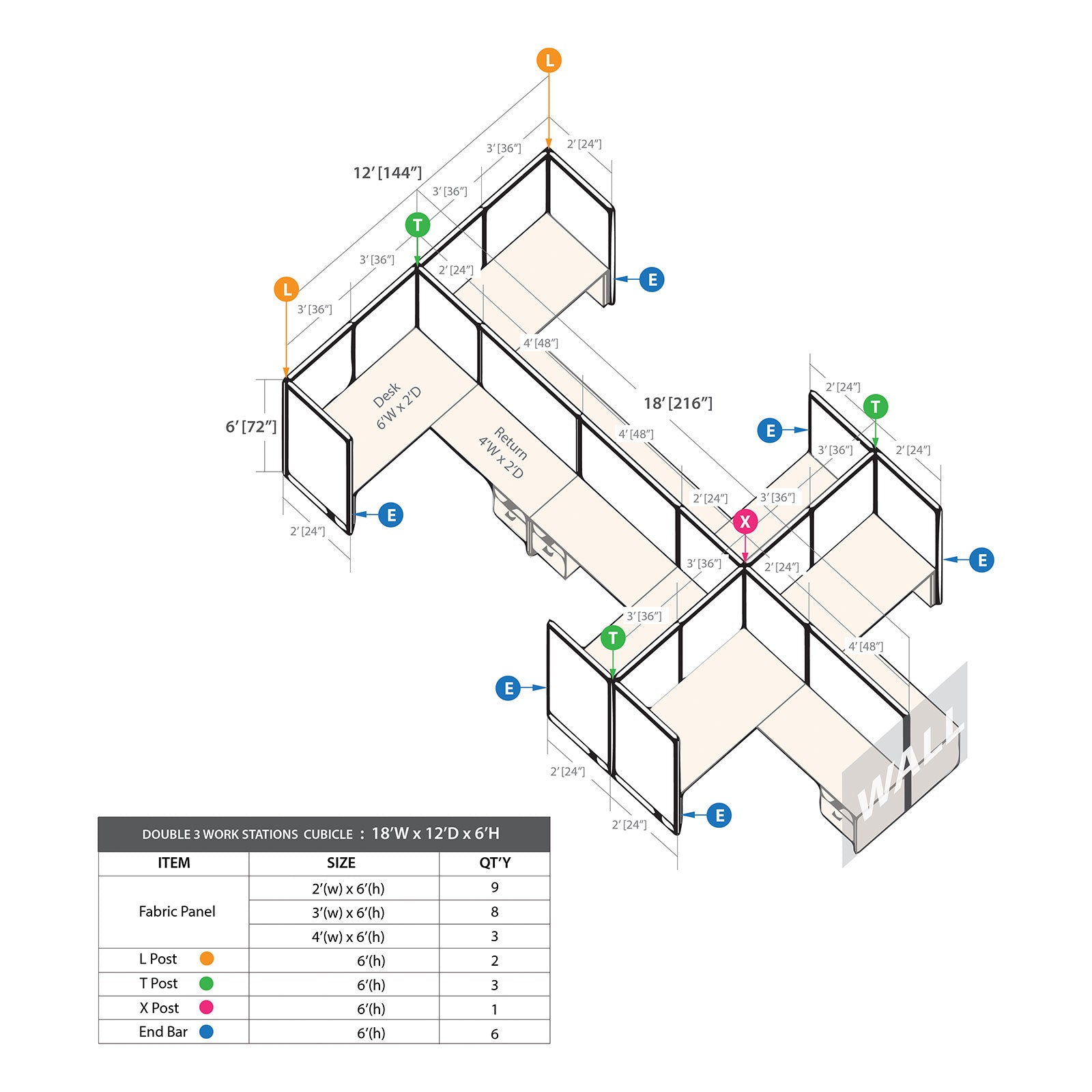 GOF Double 6 Person Workstation Cubicle (C-12'D x 18'W x 6'H)