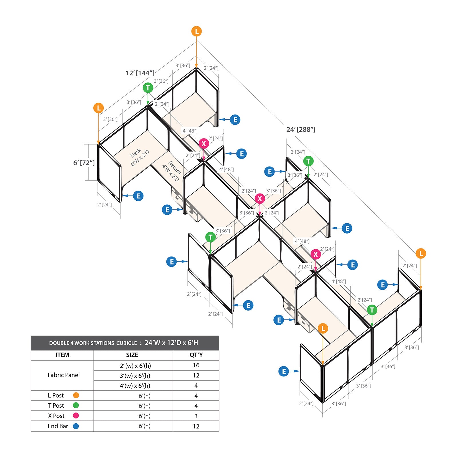 • The cubicle package includes 24"W panels(16), 36"W panels(12), 48"W panels(4), End bars(12), X post(3), T posts(4) & L posts(4).