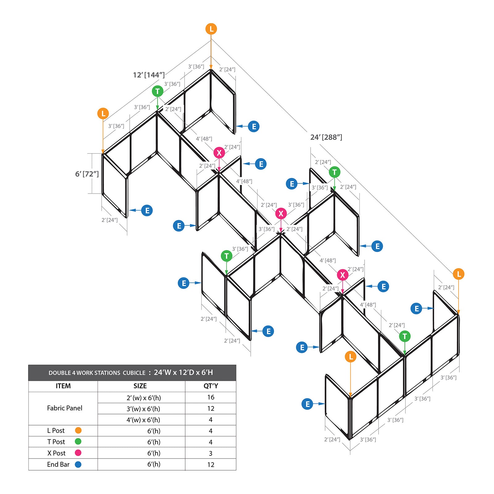 Home GOF Double 8 Person Separate Workstation Cubicle (C-12'D x 24'W x 6'H -W)