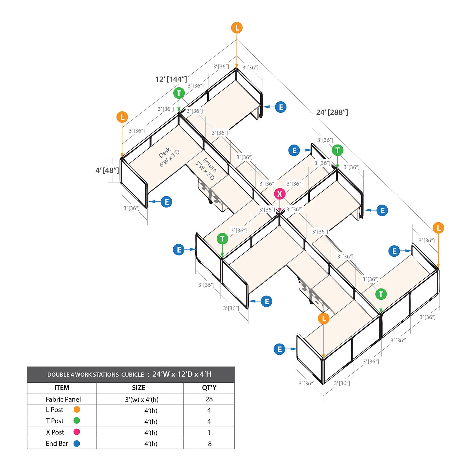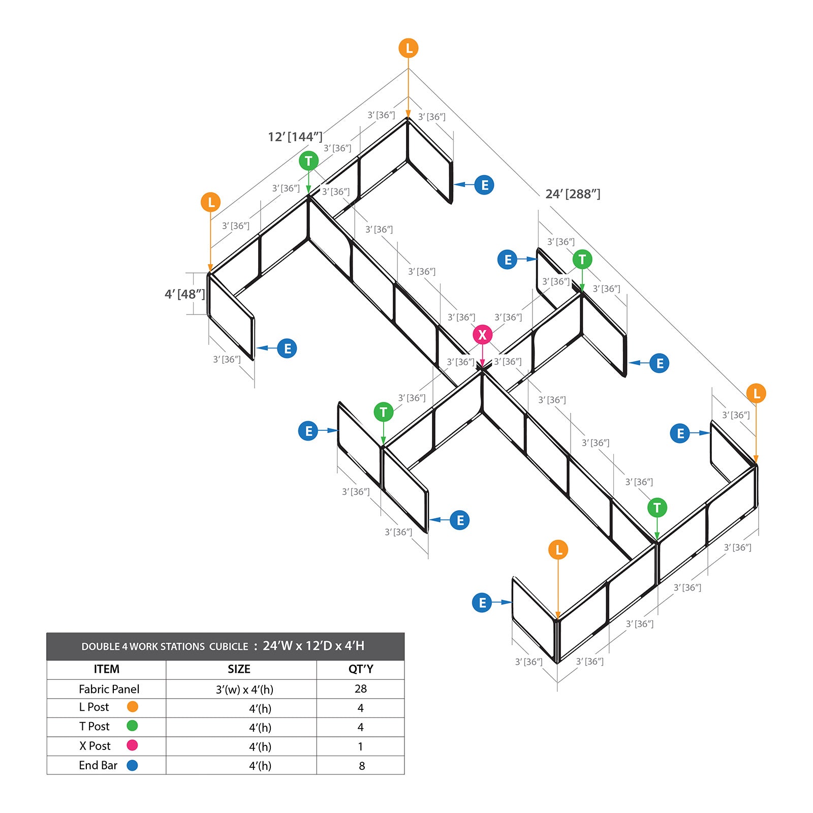 • The cubicle package includes 36"W panels(28), End bars(8), X post(1), T posts(4) & L posts(4).