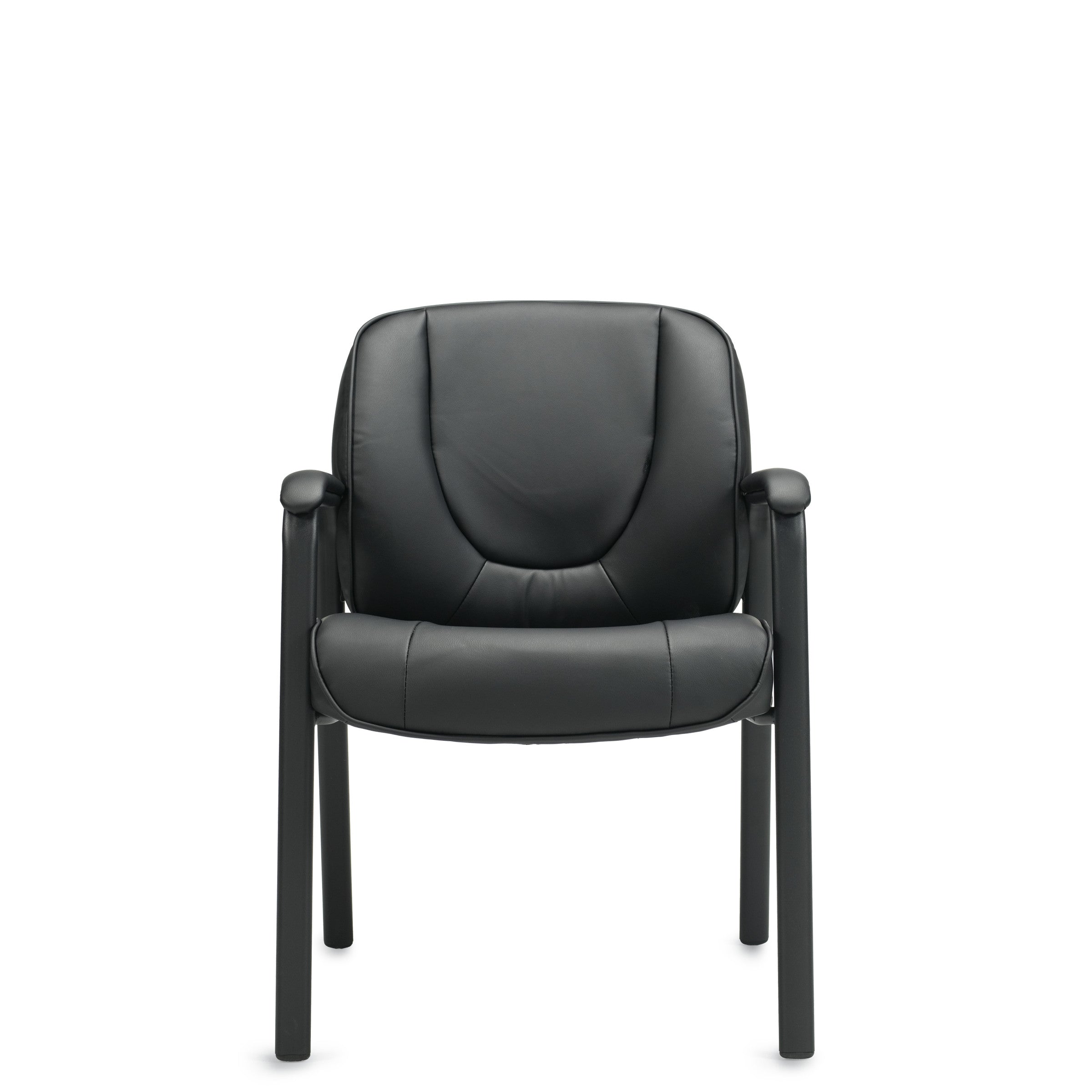 Our Luxhide Guest Chair is the perfect way to add comfort and style to any space. Its black luxhide upholstery, along with mock leather trim, is supported by a black epoxy powder-coated steel frame with upholstered armrests, ensuring a long-lasting and beautiful chair.