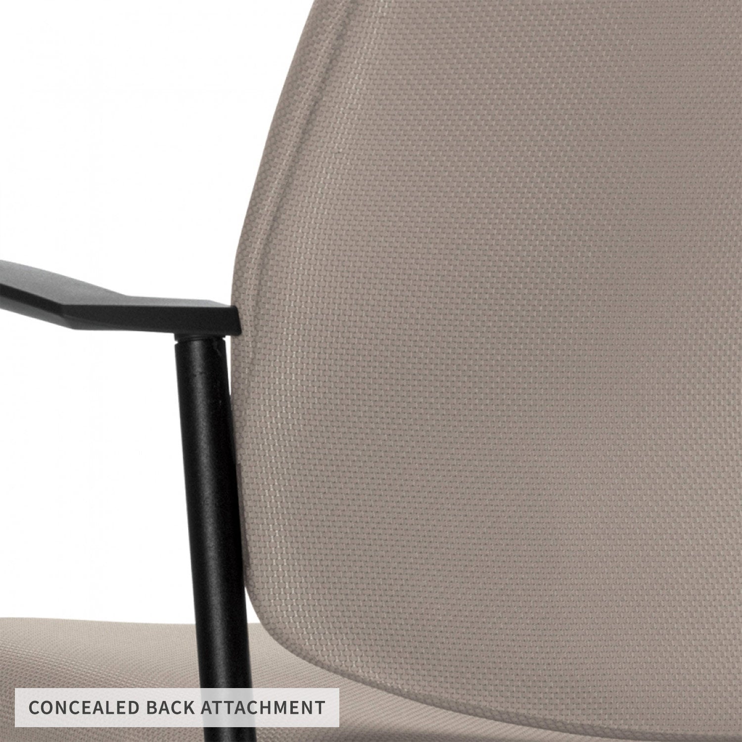 The design of Sidero Armchair ensures wall safety, as the four legs are arranged so that the back legs hit the baseboard first, creating a clearance between the seatback and the wall to prevent damage to both.